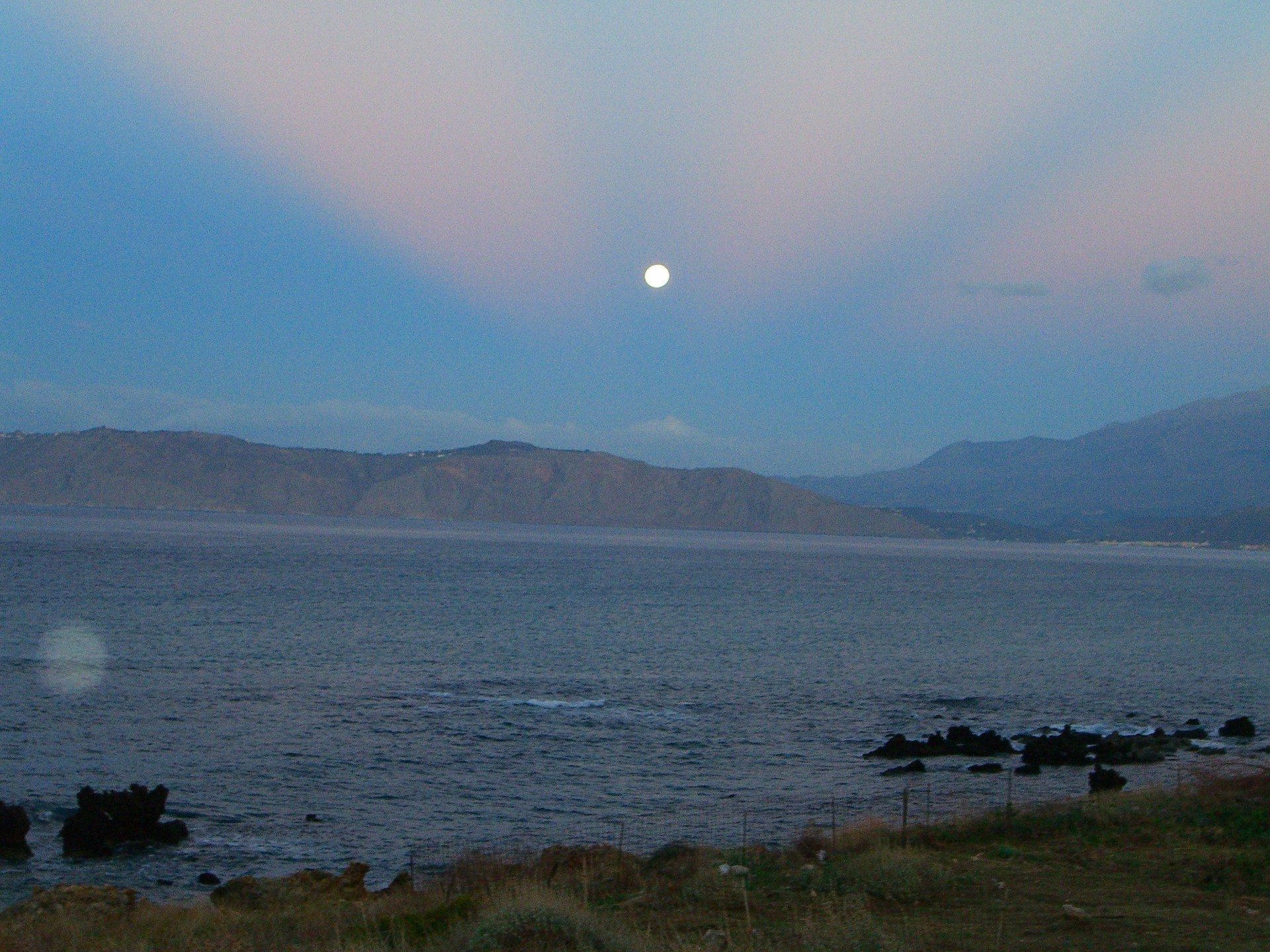O sol distante sobre o lago e as montanhas