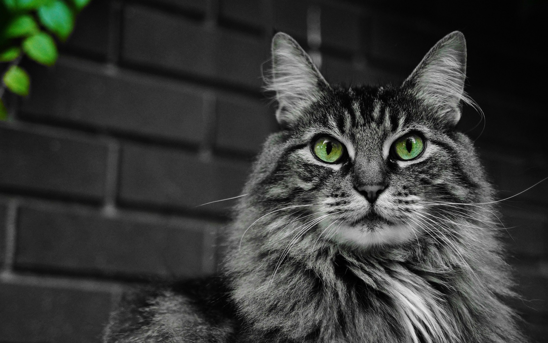 Gato cinza com olhos verdes na parede