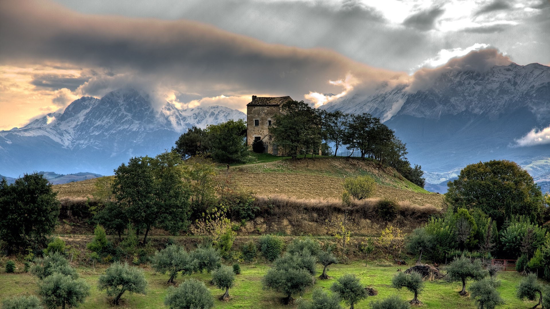 Uma casa na colina. paisagem com montanhas