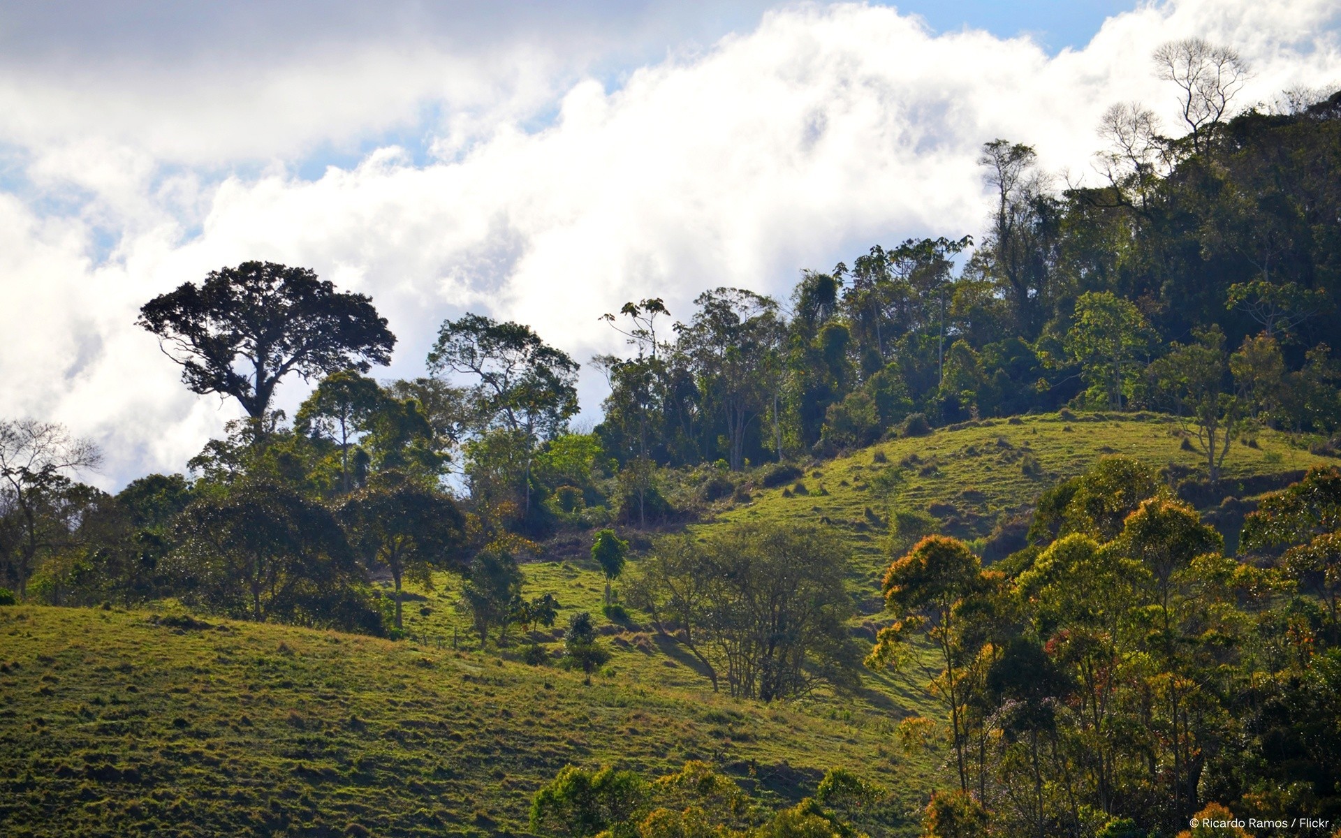 Um carro viaja pela auto-estrada contra o pano de fundo das colinas e do céu nas nuvens