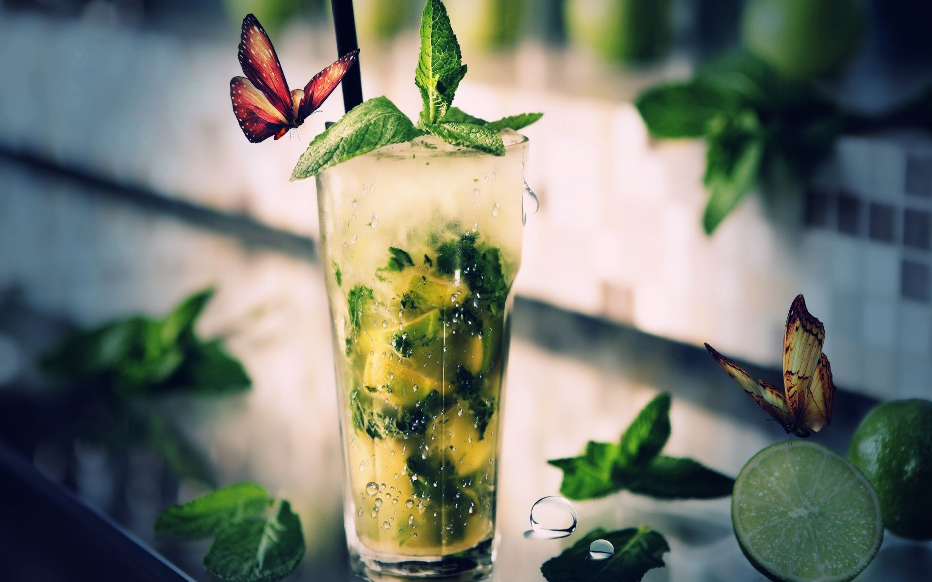 Bebida com frutas em vidro e borboleta