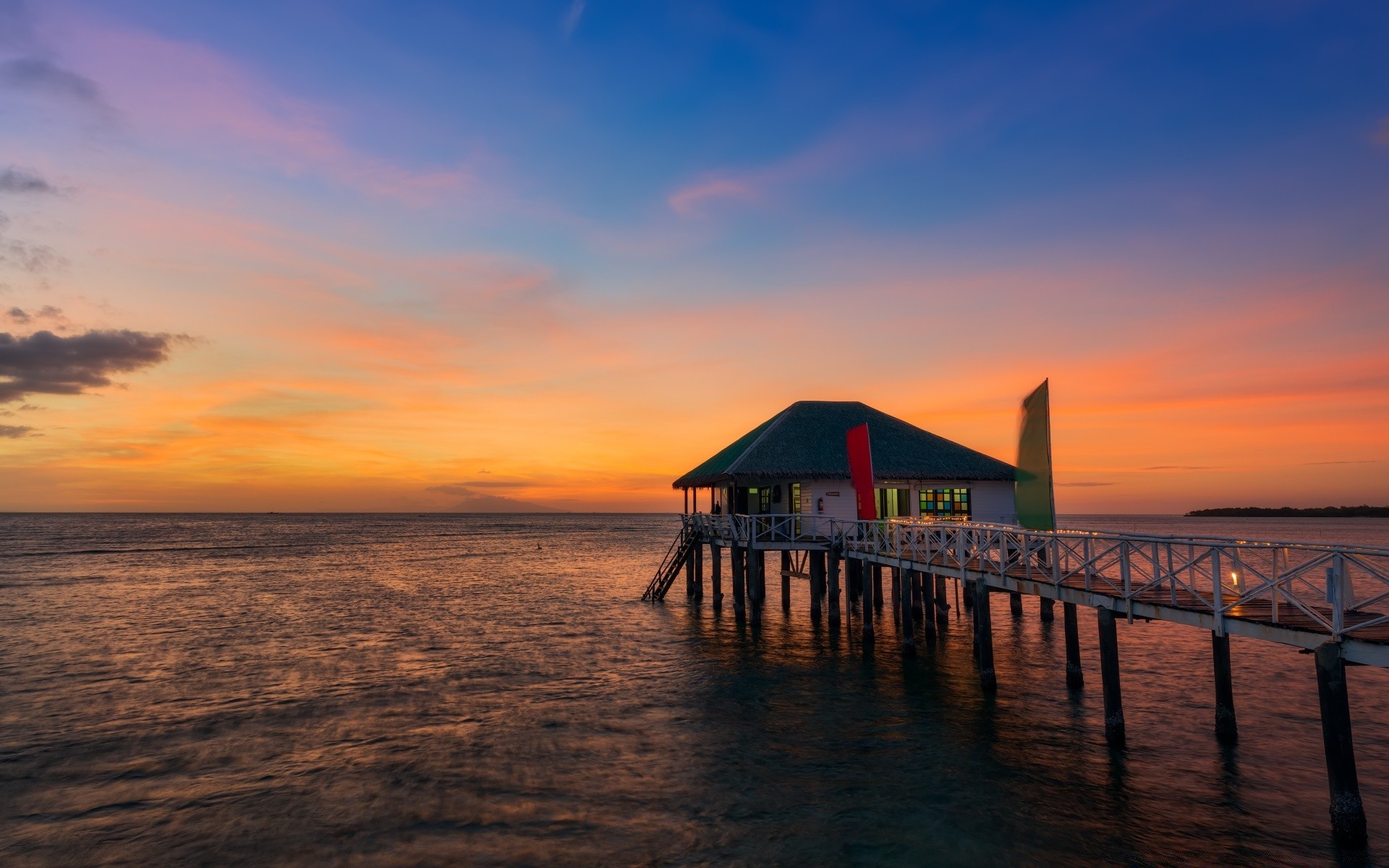 Bela Vista do pôr-do-sol. Casa sobre a água do oceano