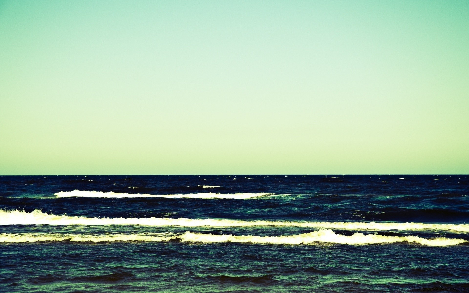 Praia rochosa do mar, céu do pôr do sol, névoa leve sobre a água