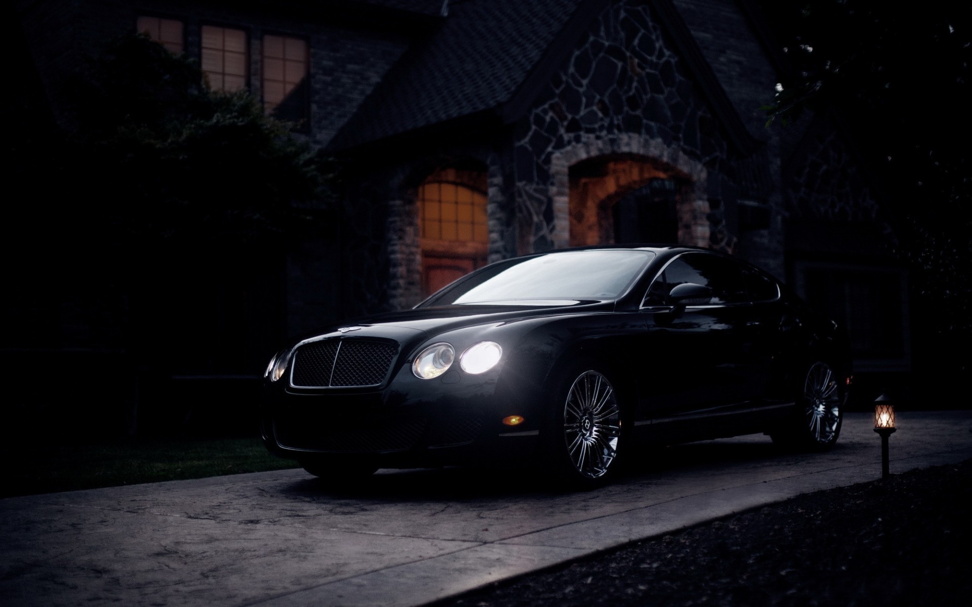 Um Bentley preto na estrada no inverno. No fundo das montanhas e do céu