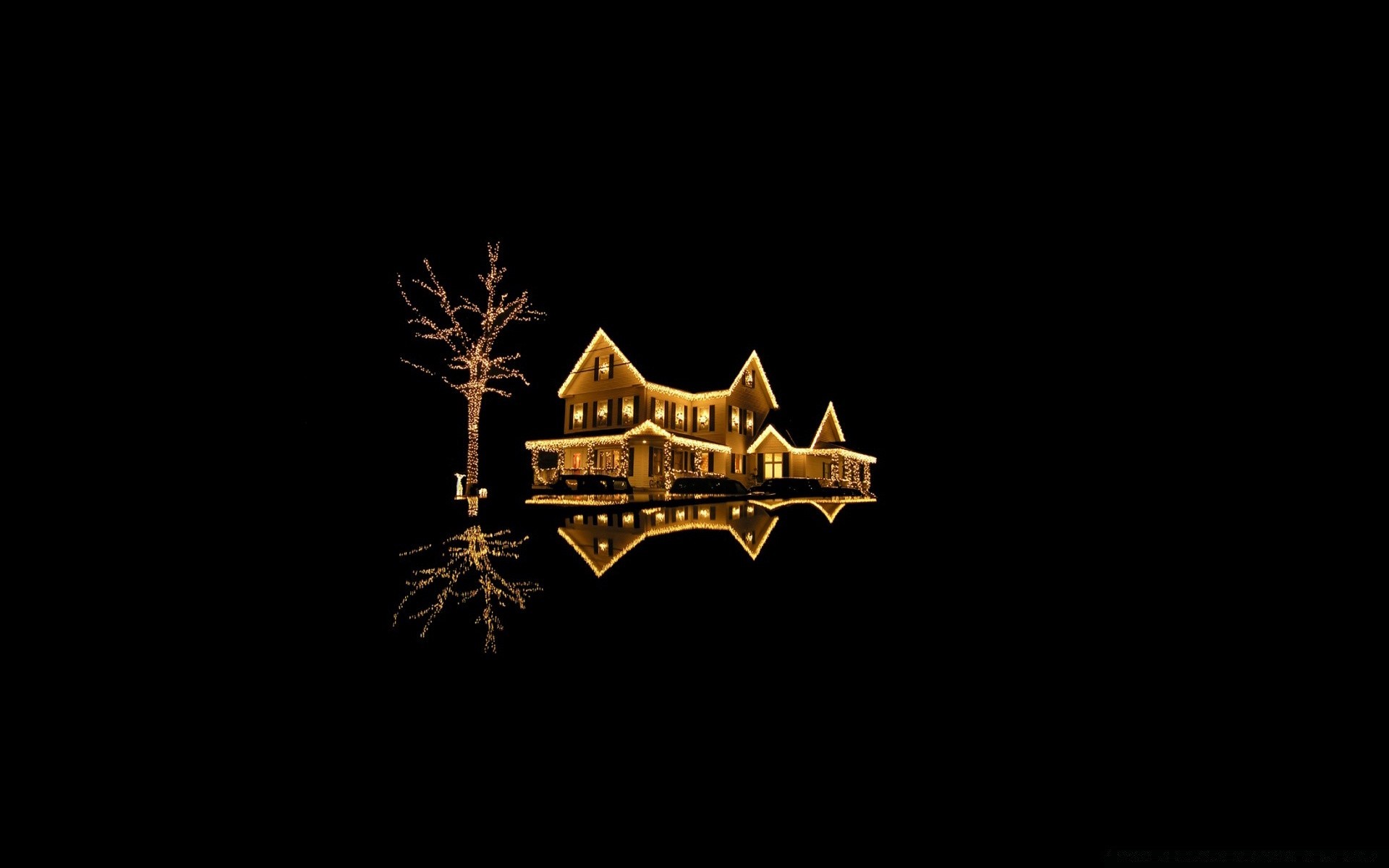 Casa e árvore em luzes brilhantes