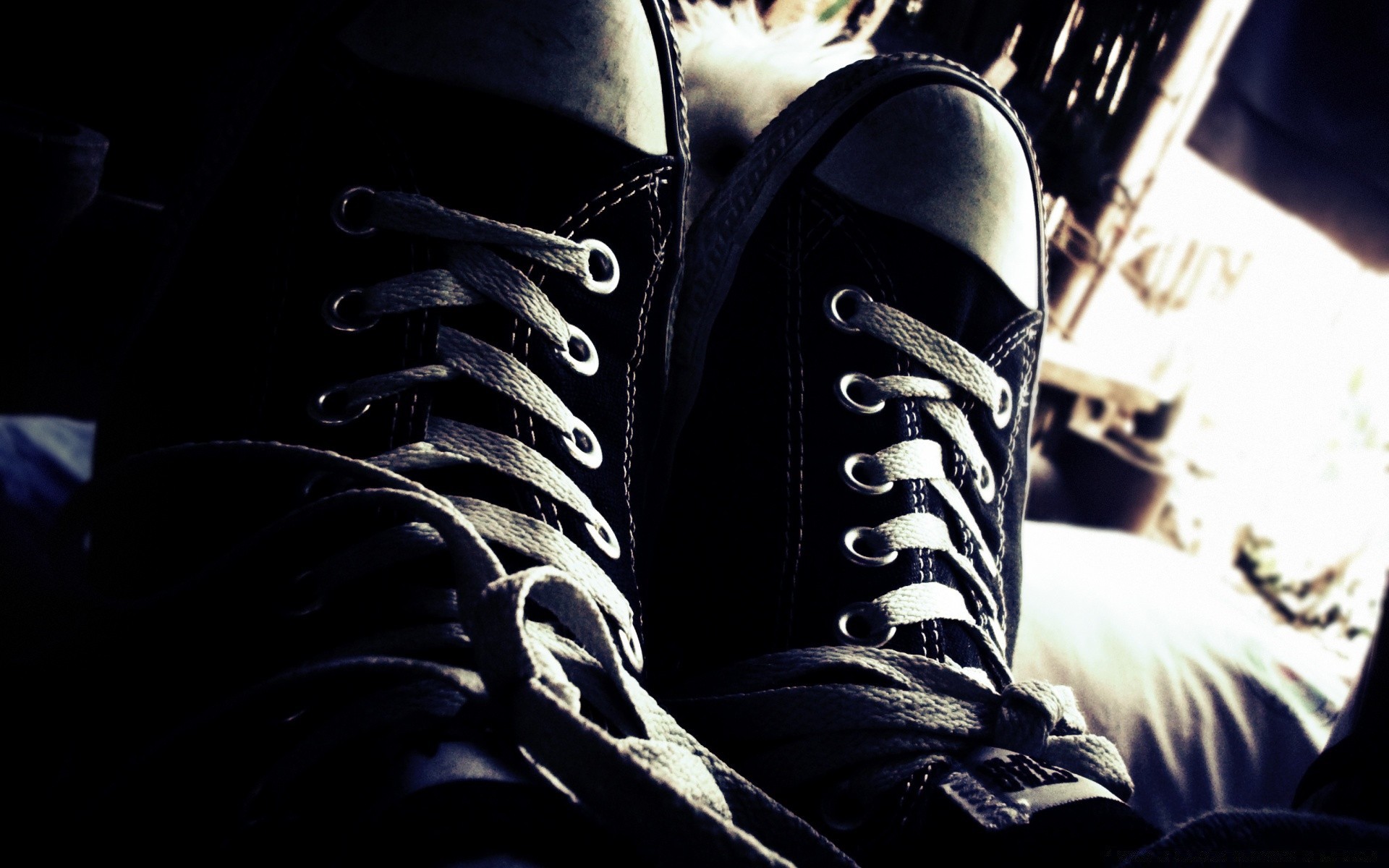 Perna em tênis pretos com cadarços brancos