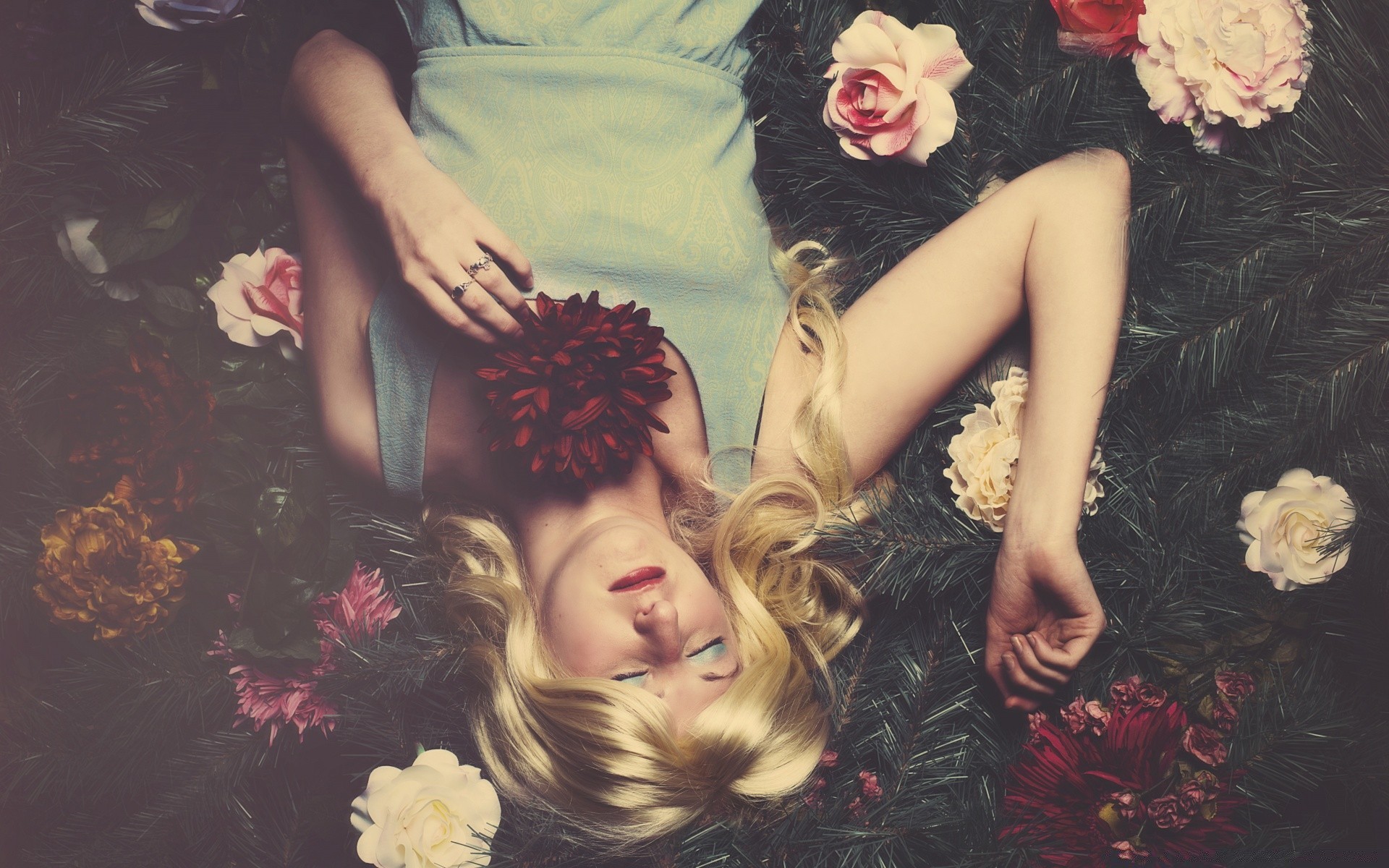 Mulher com cabelo branco dorme em flores