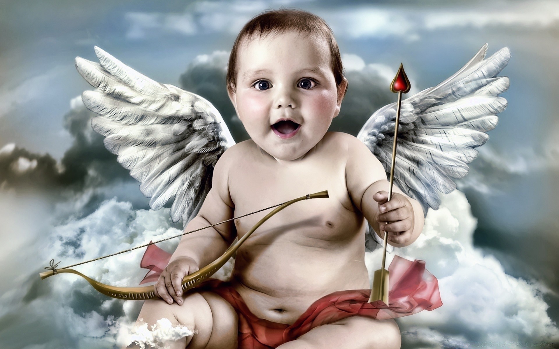 Pequeno e fofo bebê Cupido dando uma flecha nas nuvens