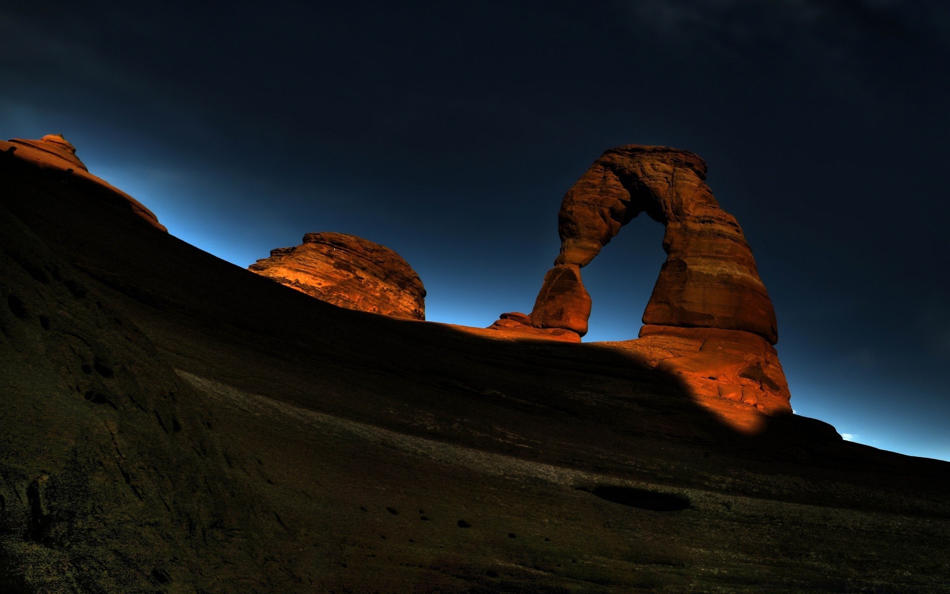 Um pôr do sol fascinante no deserto. Rochas e céu