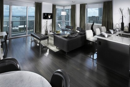 Sala de estar em tons de bege com vista para a águaSala de estar em tons de bege com vista para a água