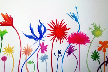 Flores brilhantes no fundo das montanhas e cachoeiras