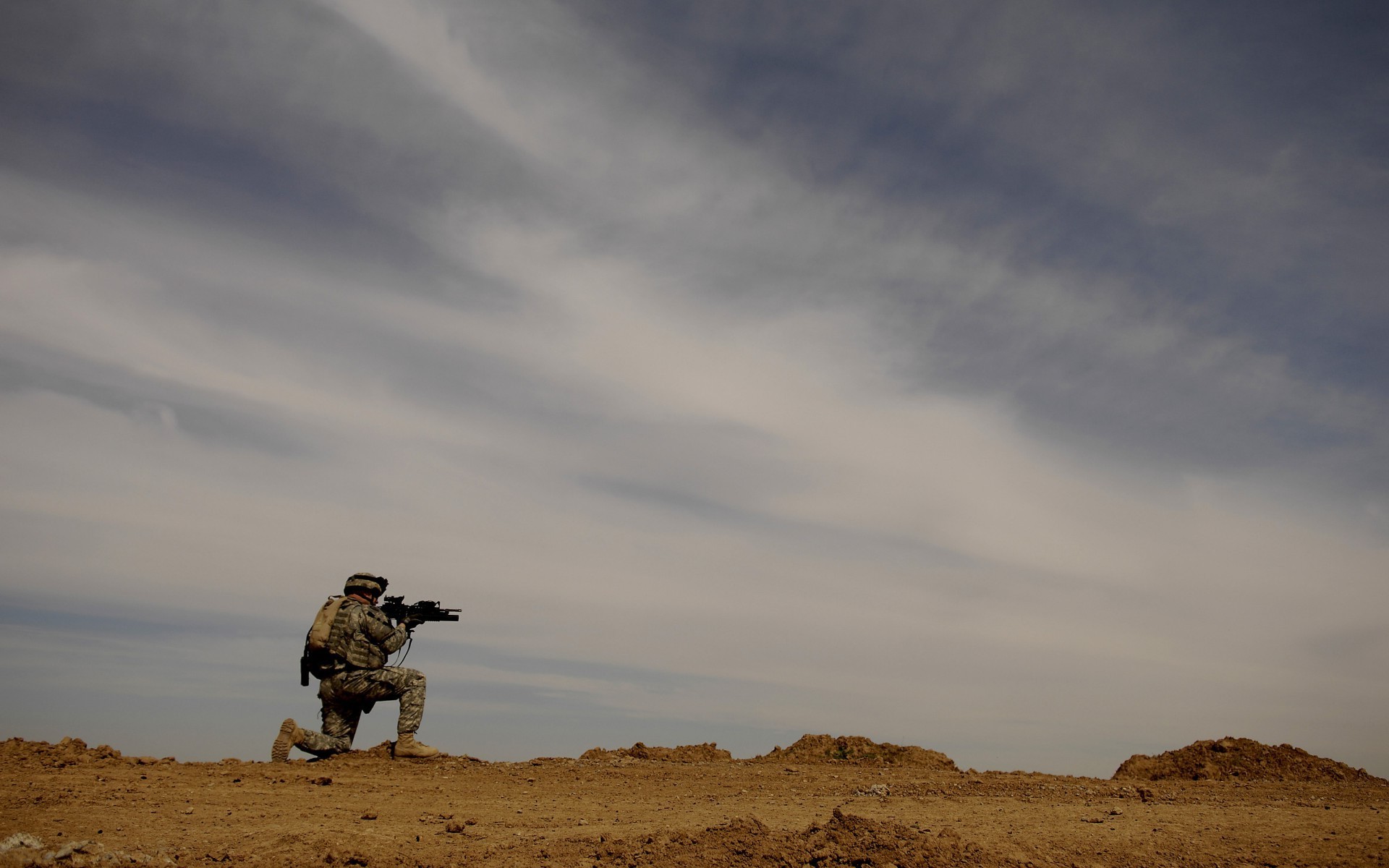 Soldado de infantaria agressivo joga coquetel molotov em chamas