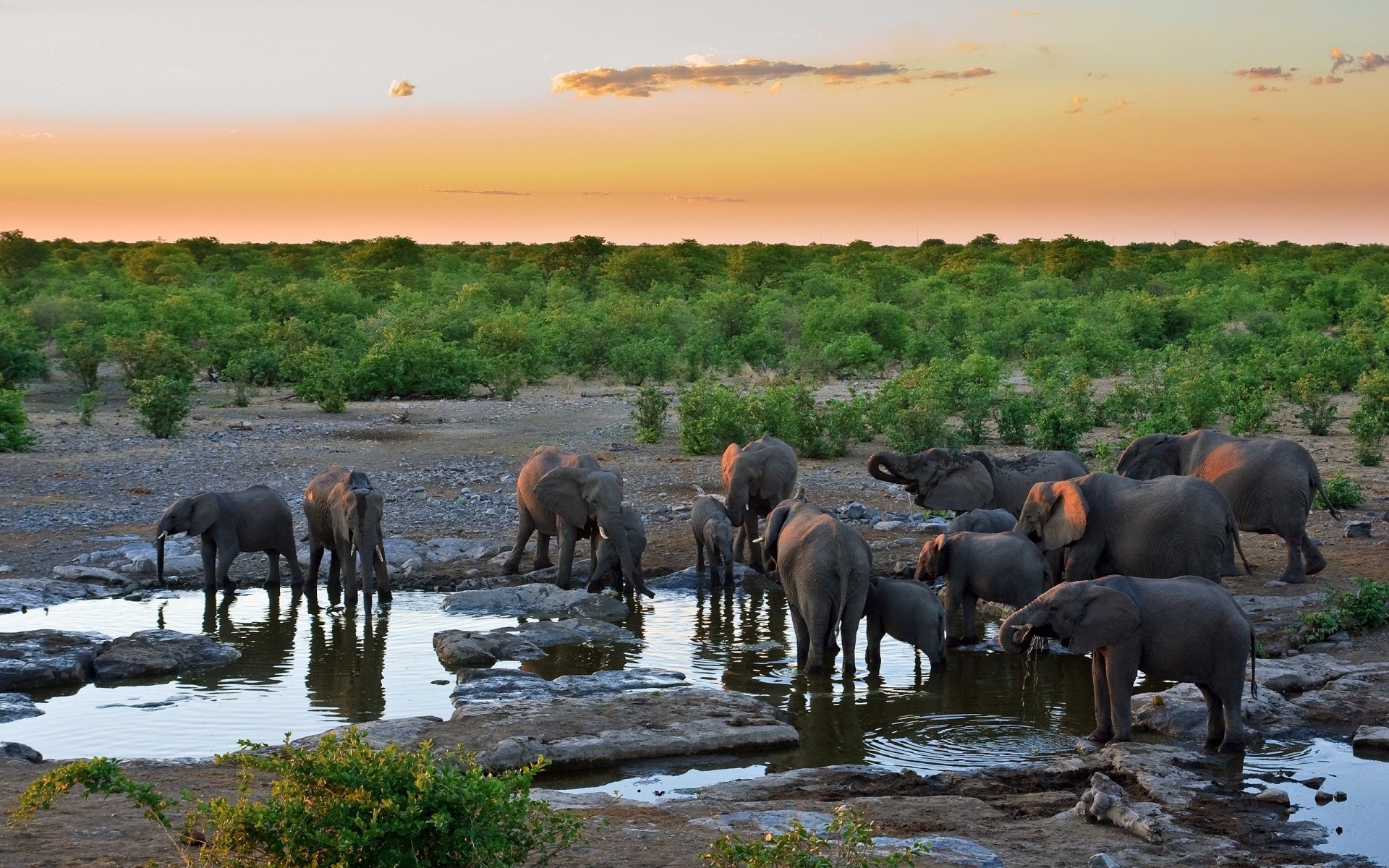 Elefantes chegam para beber à noite