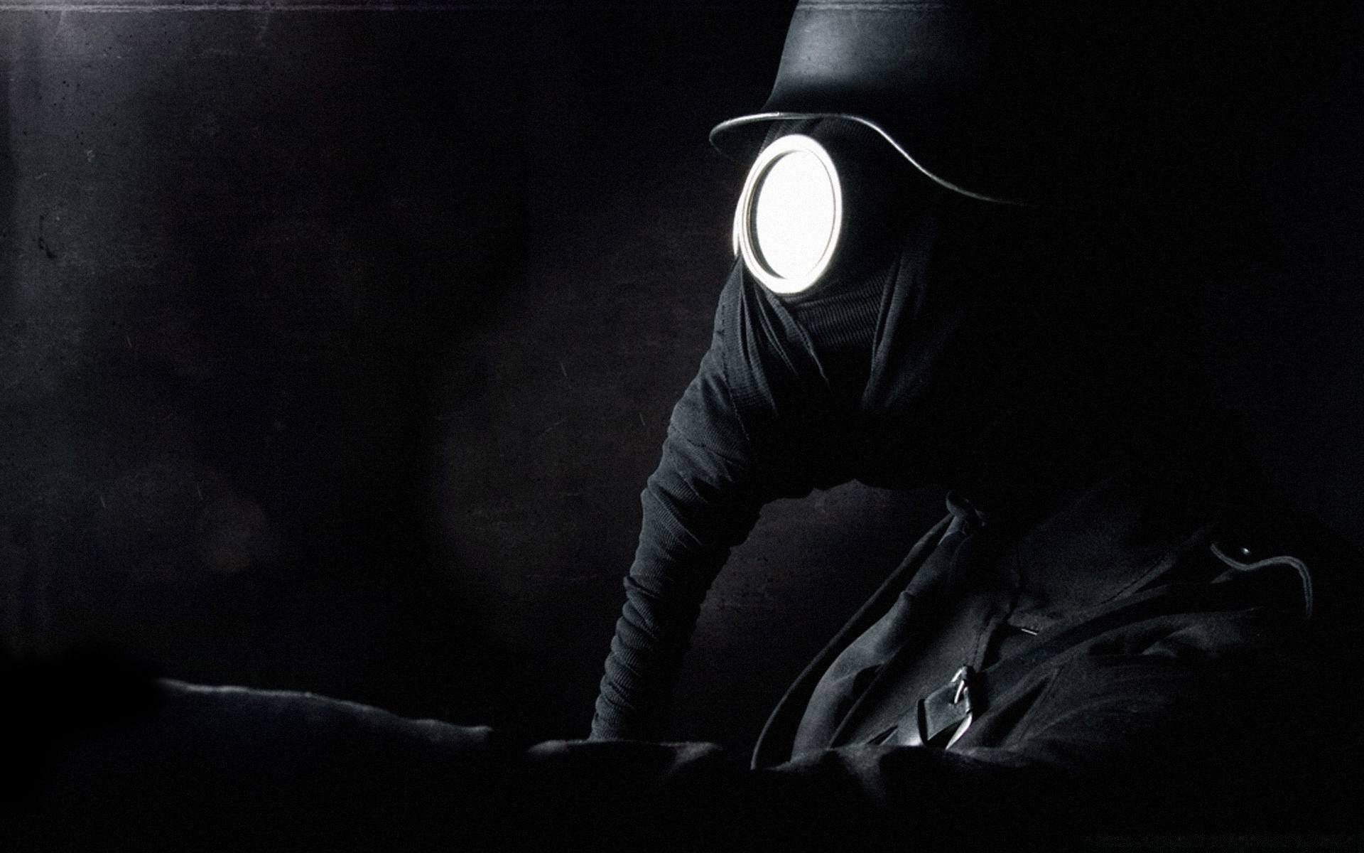 Foto em preto e branco de um homem mascarado em um fundo escuro
