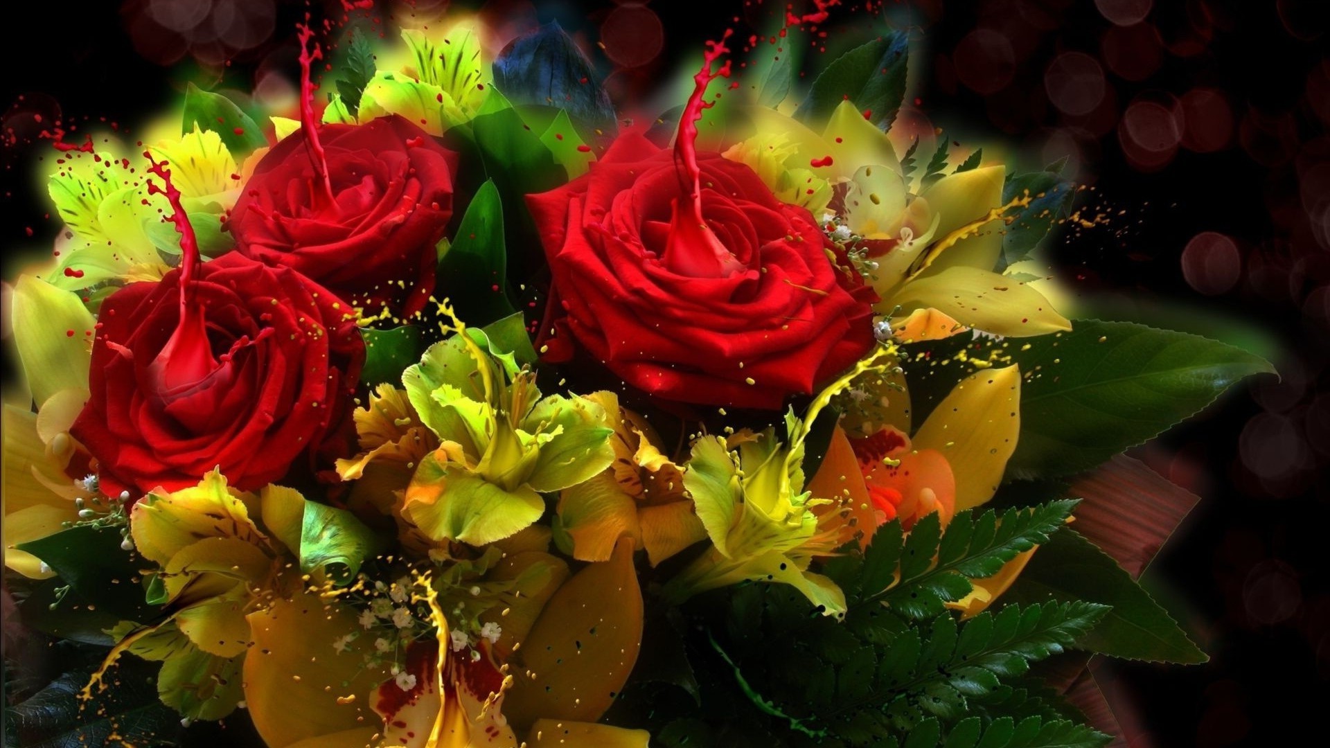 Buquê de rosas vermelhas e orquídeas amarelas em um fundo escuro