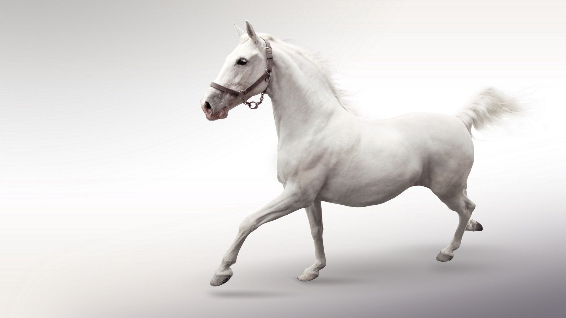 Cavalo cinzento contra o céu azul e a coroa das árvores