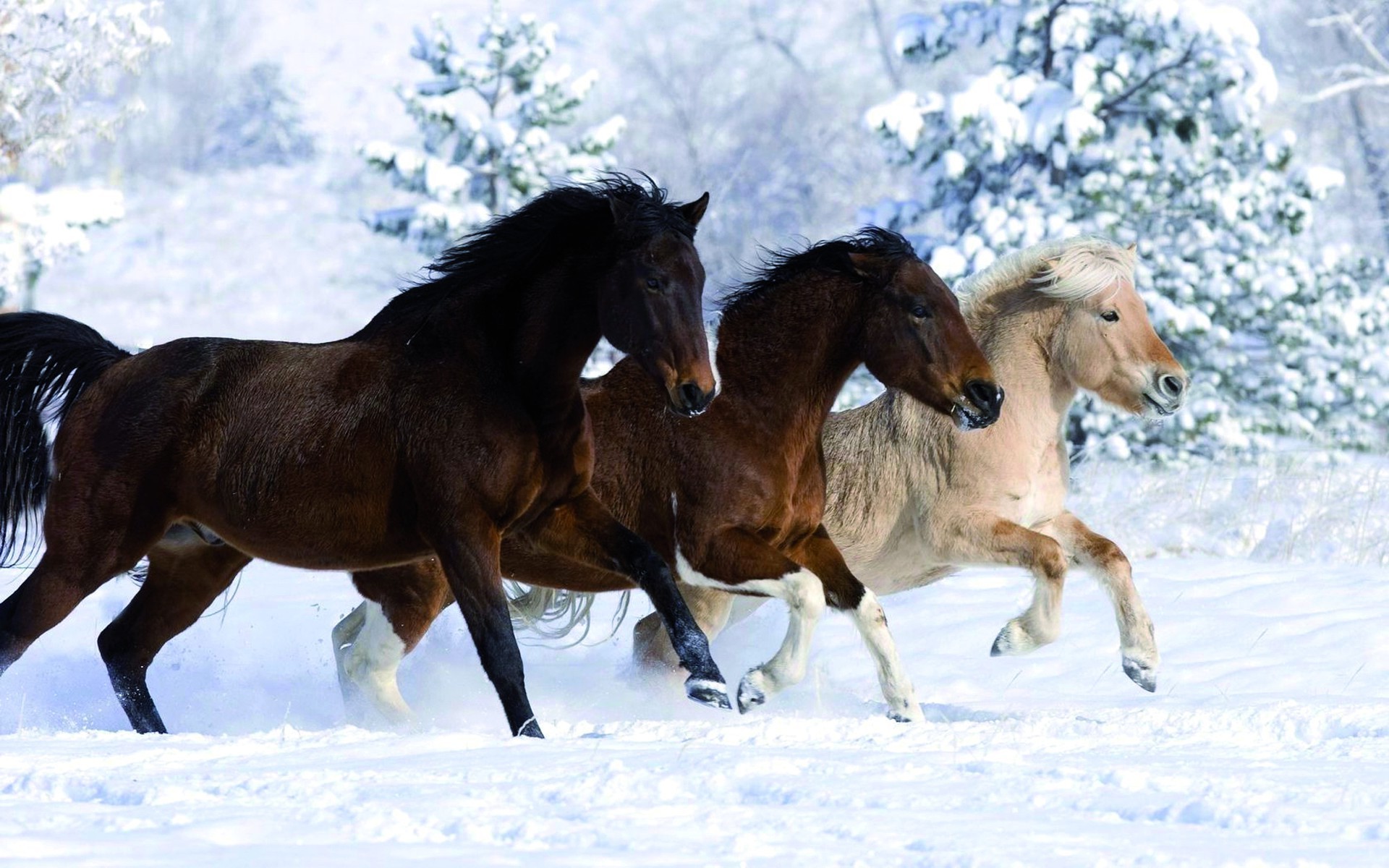 Cavalos brancos e vermelhos correm pela trilha da floresta