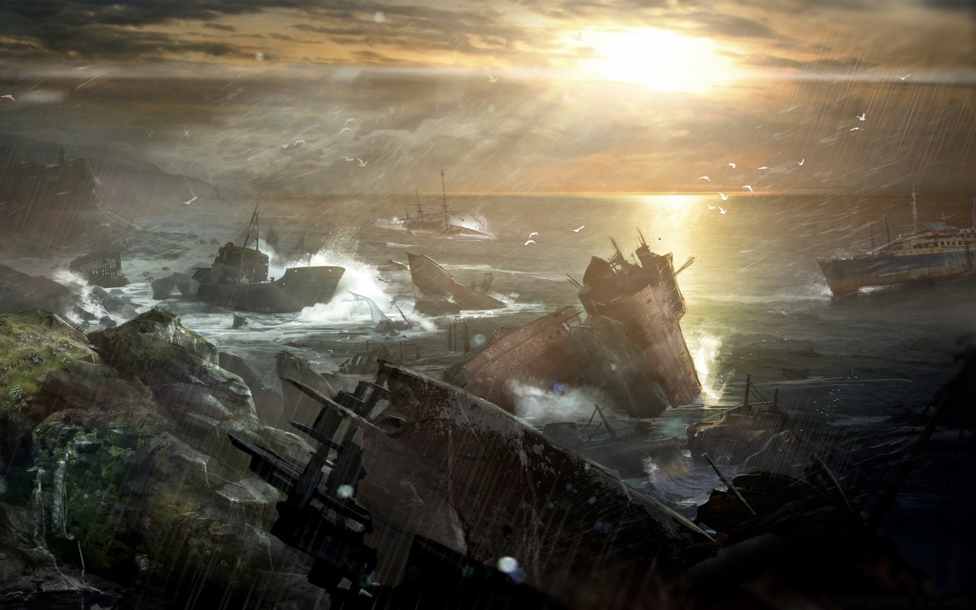 Mar agitado perto da costa, onde navios e outros equipamentos são abandonados