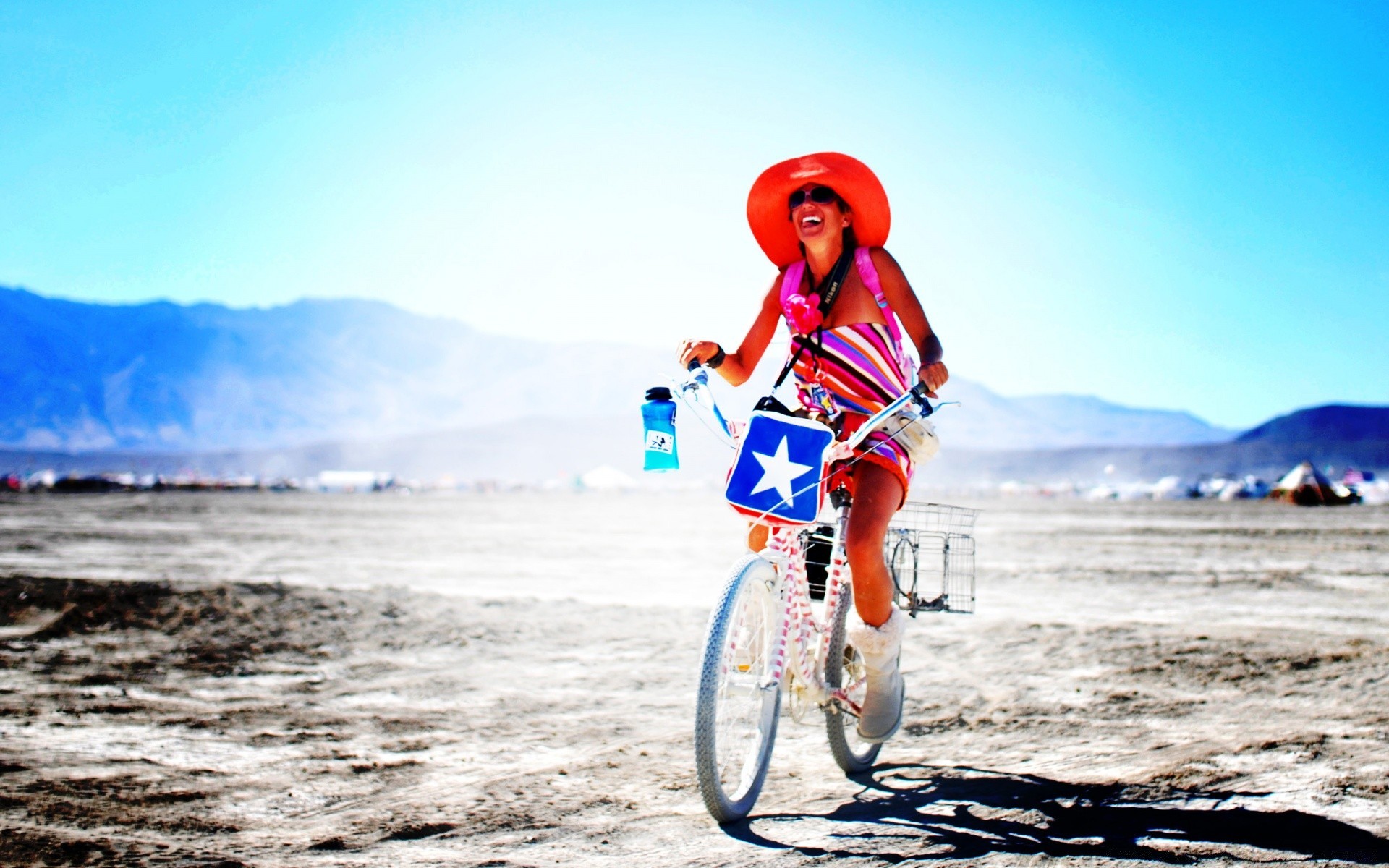 Menina em sacos anda de bicicleta