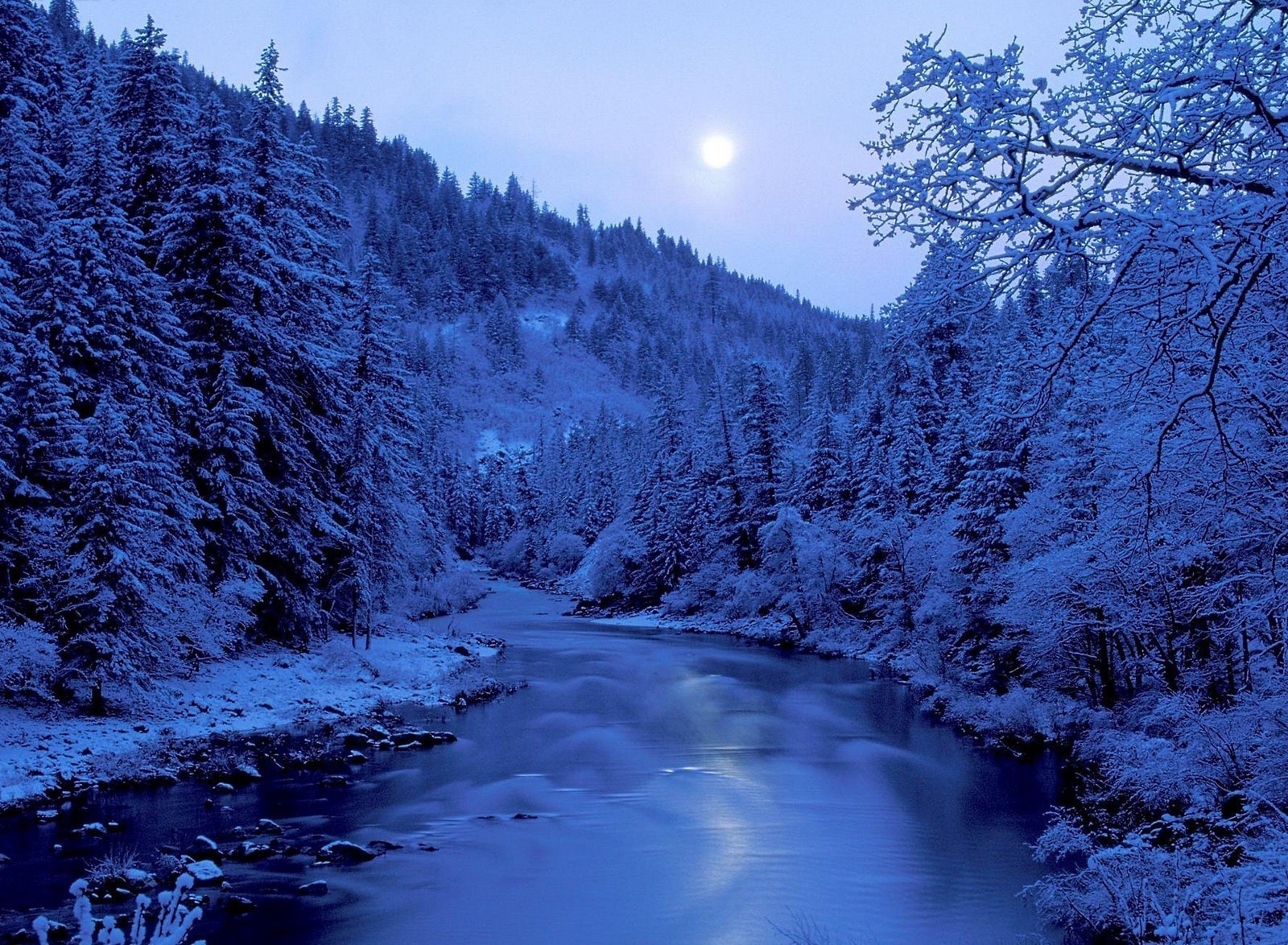 Paisagem de inverno, floresta coberta de neve e Rio
