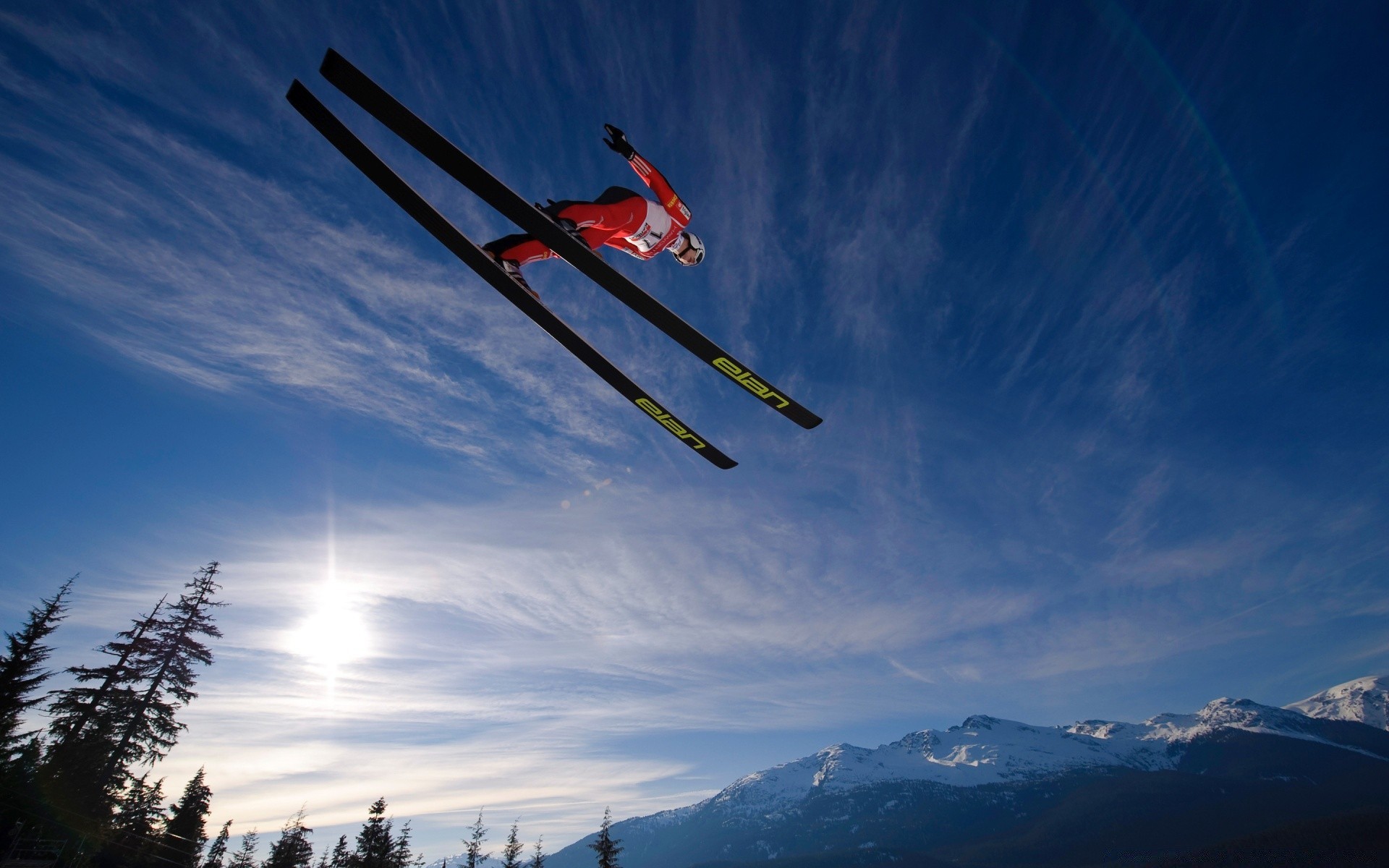 Um piloto de esqui em um salto de montanha