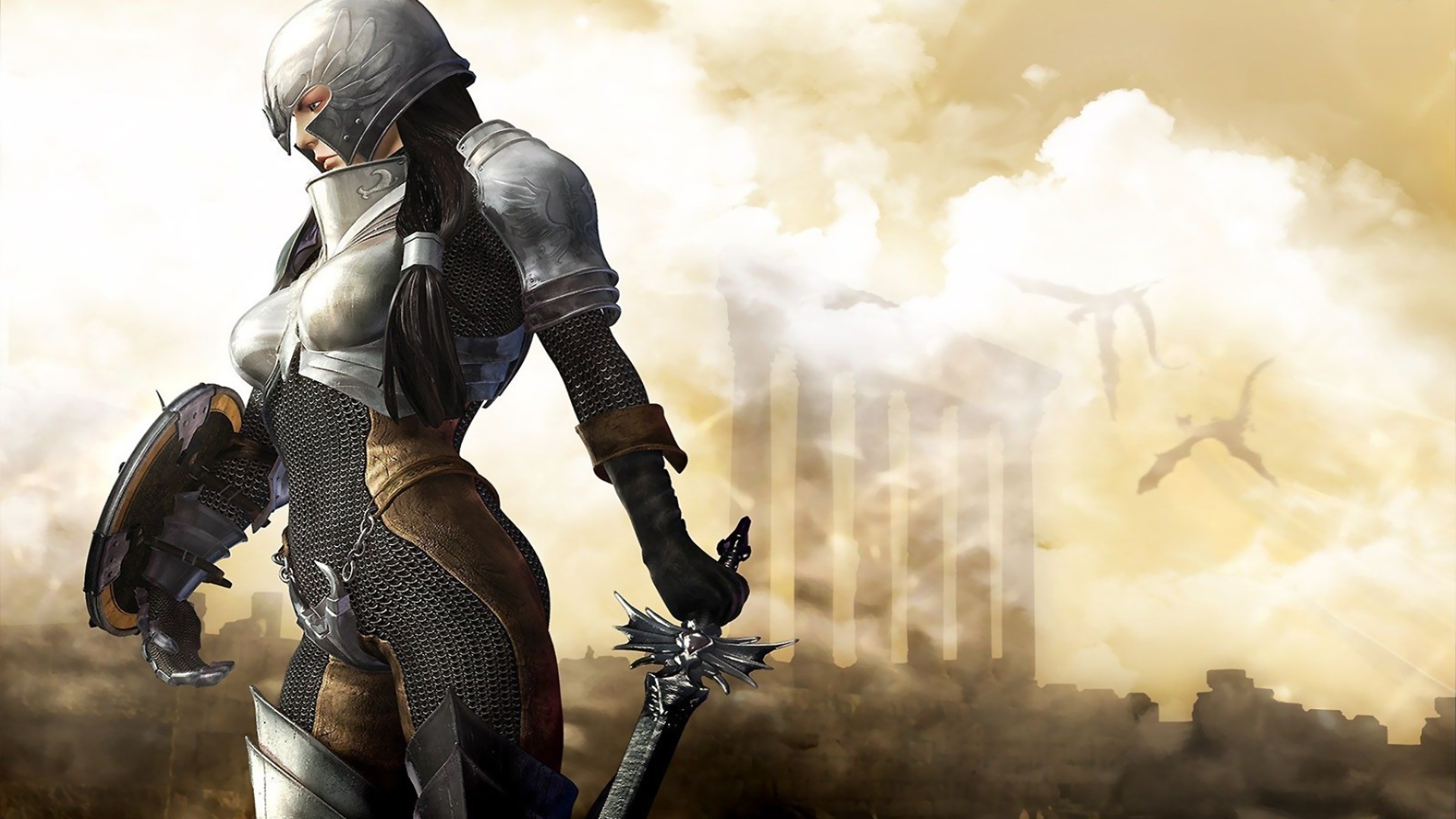 Em armaduras de ferro, capacete e com uma espada, a garota percorre sua luta em pensamento