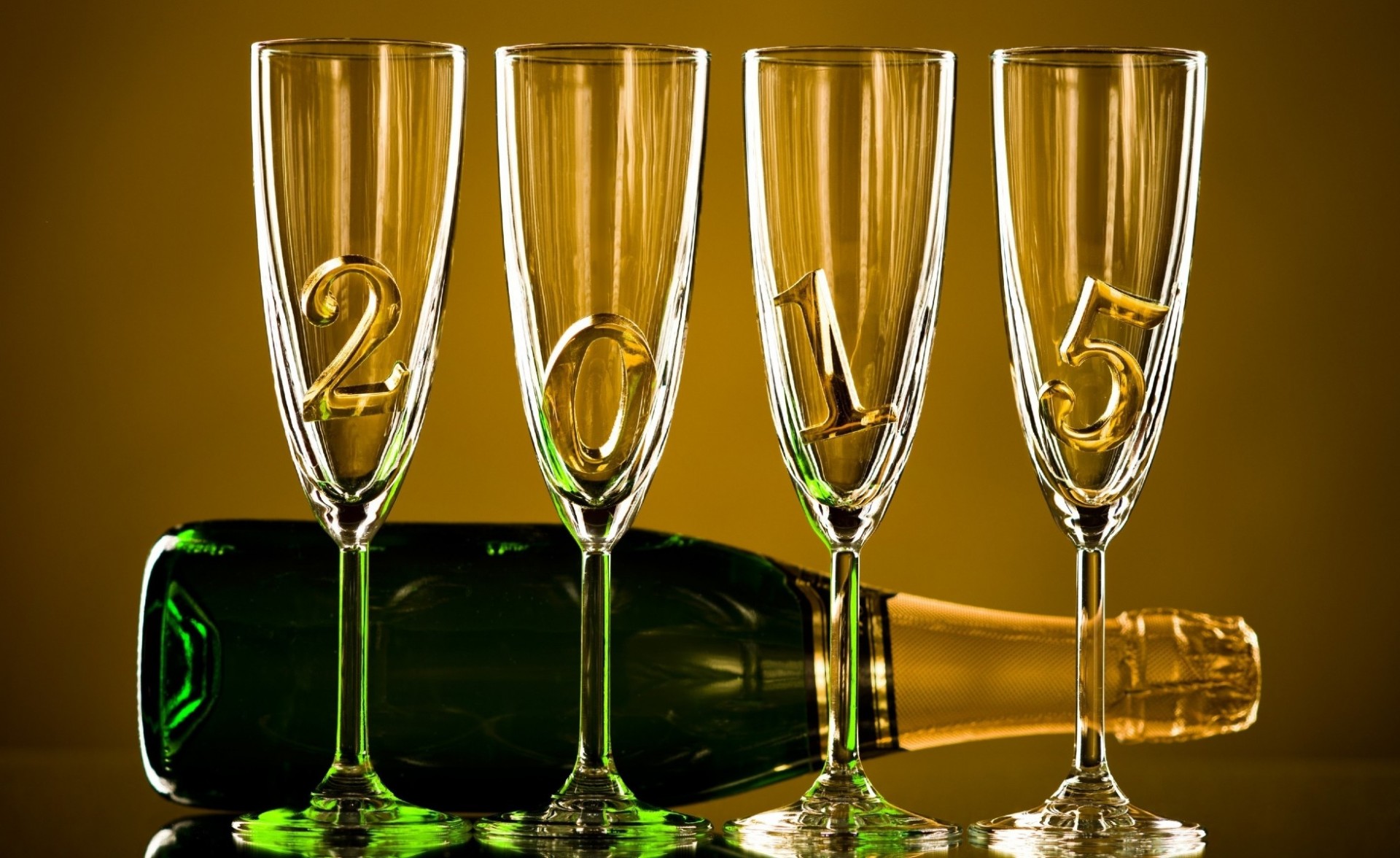 Uma garrafa de champanhe. Taças com inscrições 2015