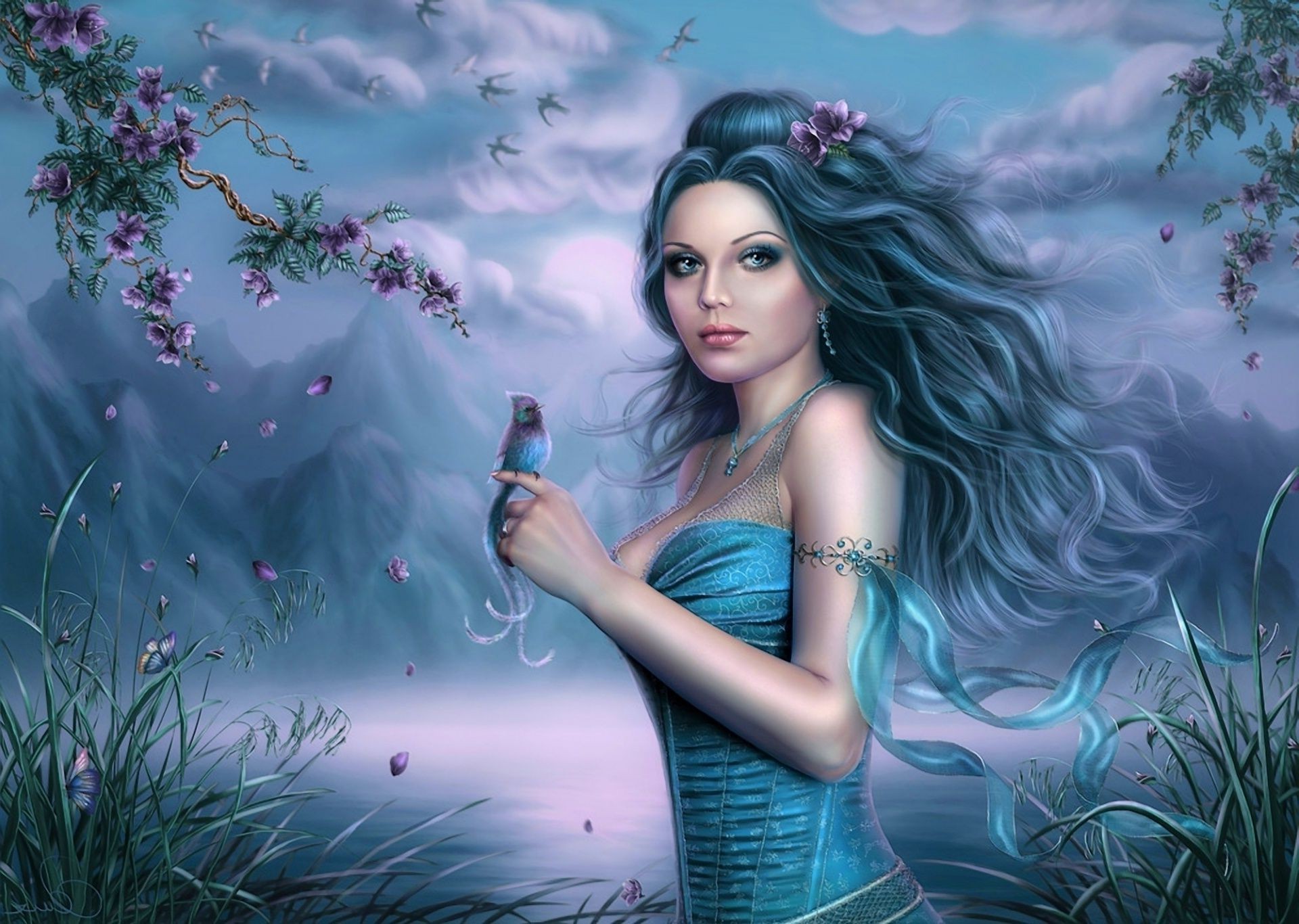 Ivenzia Lagoa Arte Lago flores menina pássaro árvore