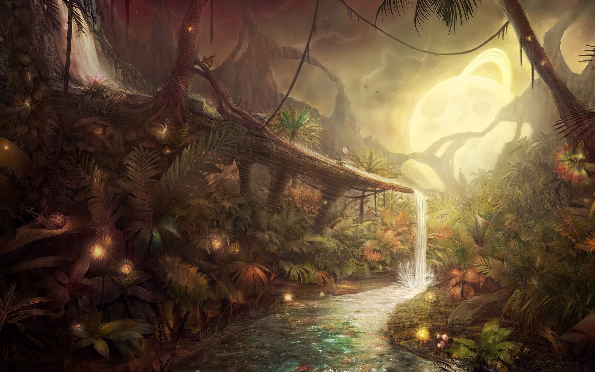 Paisagem de fantasia, selva na noite, cachoeira e Rio
