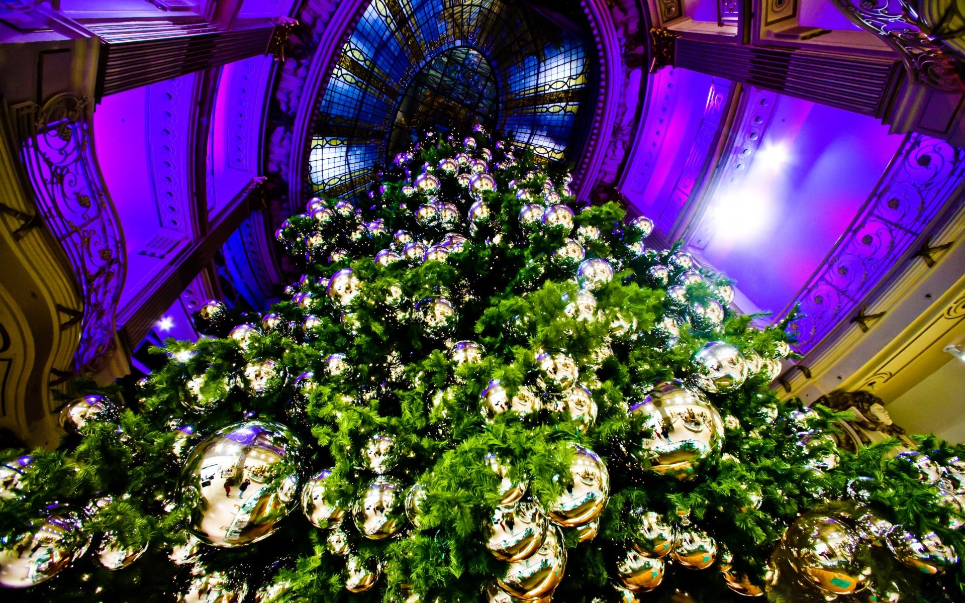 Foto da árvore de natal decorada com bolas de ouro abaixo