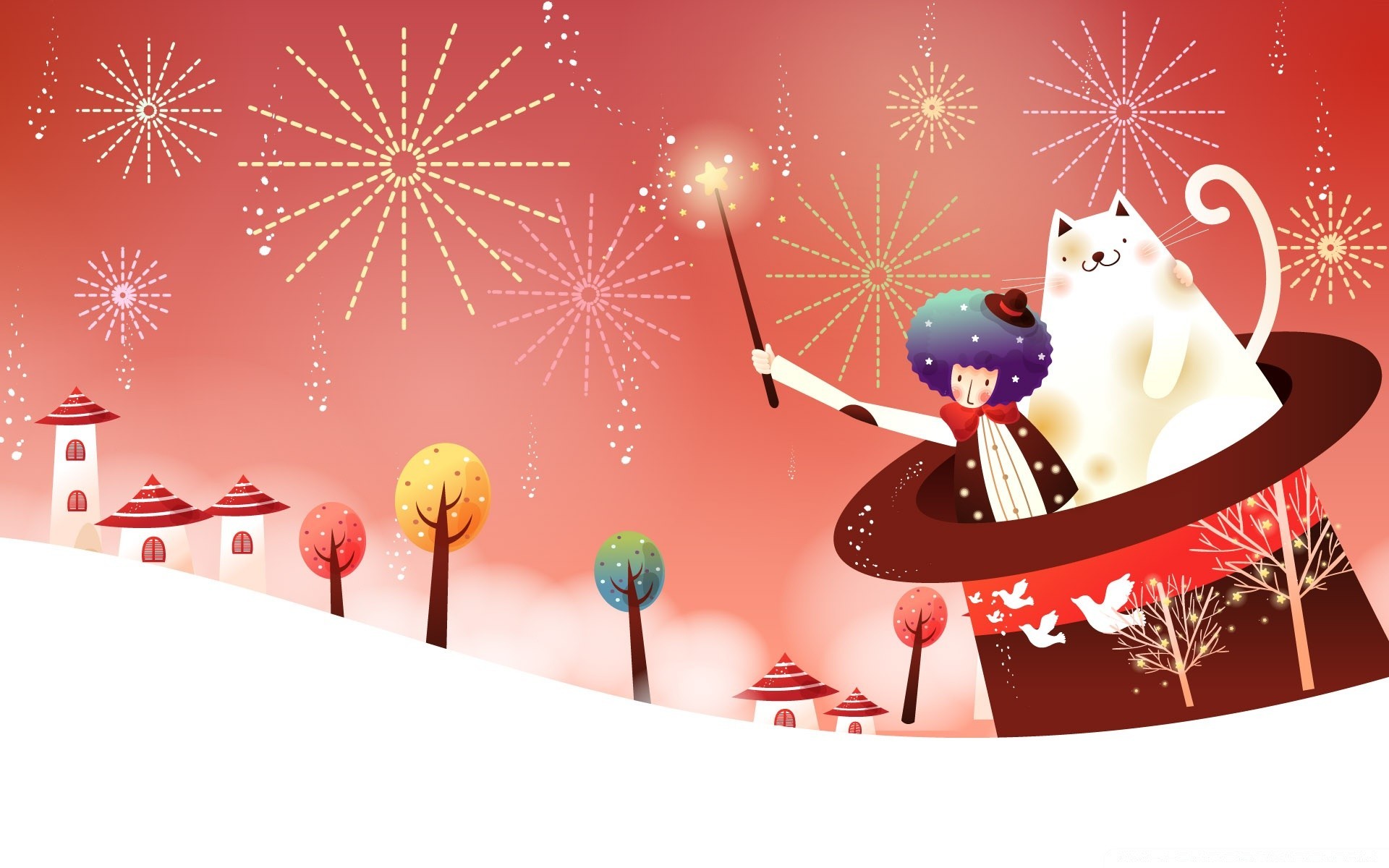 Um gato e um feiticeiro com um chapéu fazem magia no Natal