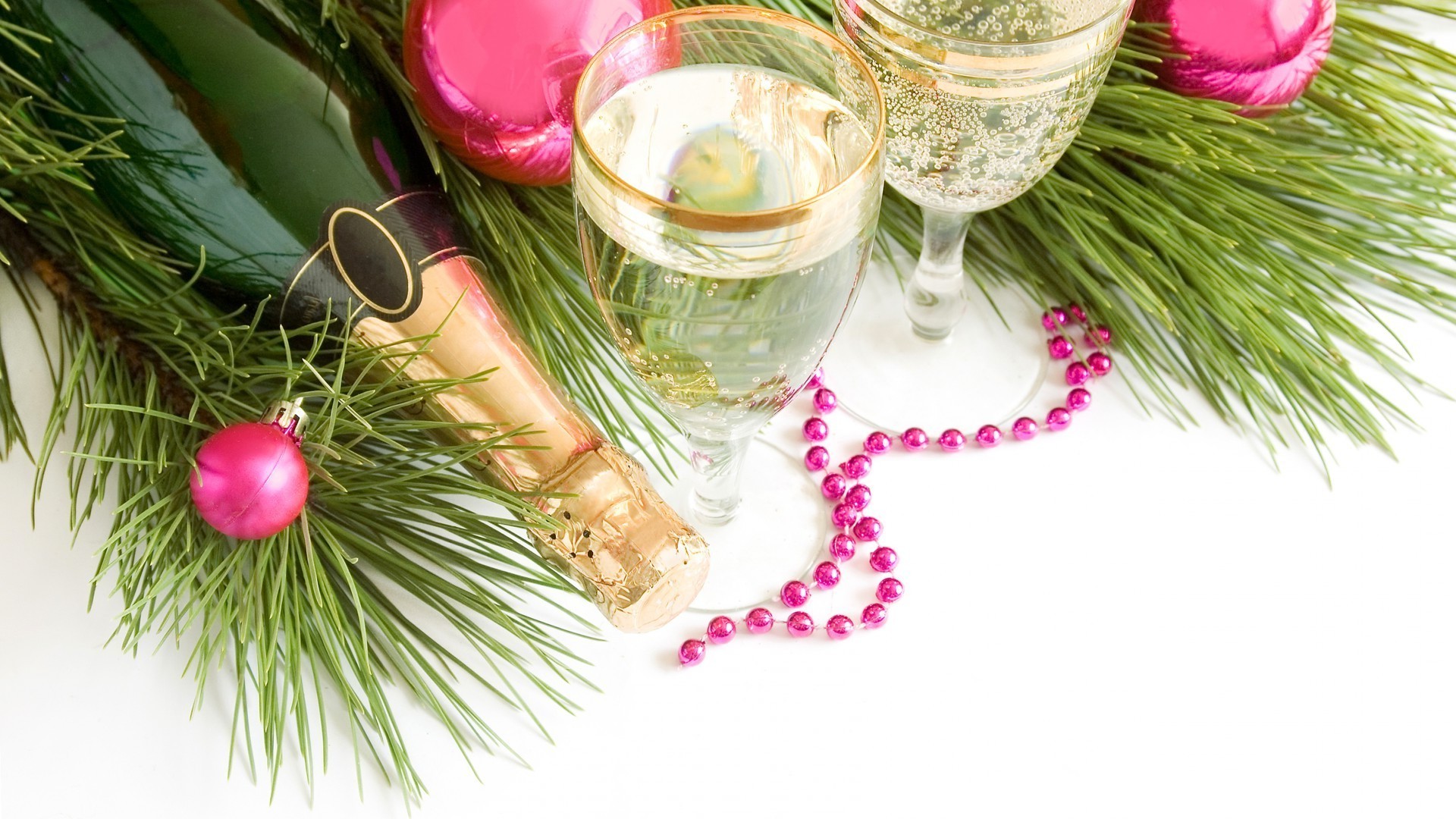 Presente de Natal com champanhe e copos em fundo de cor sólida