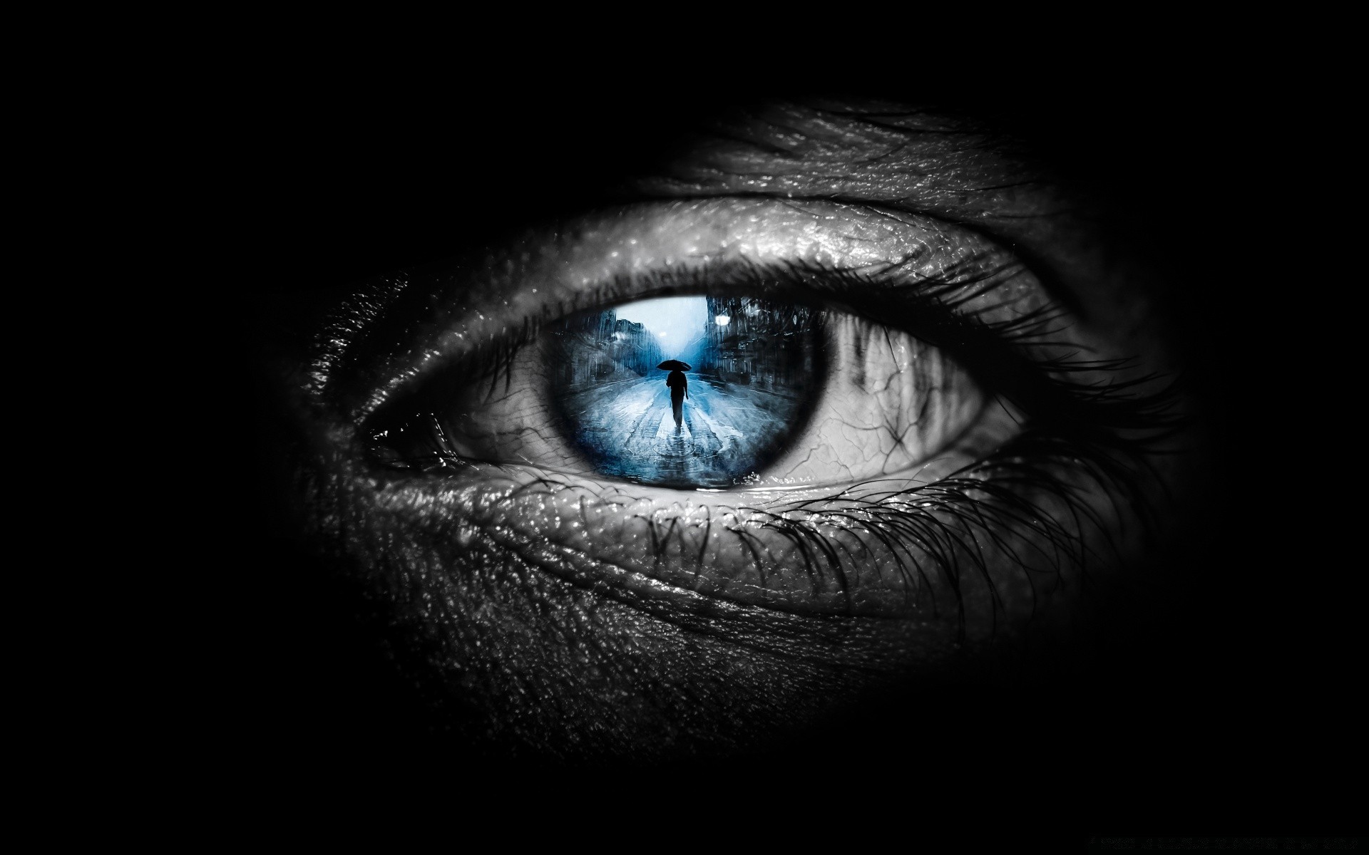 Olho humano que mostra uma pessoa com um guarda-chuva