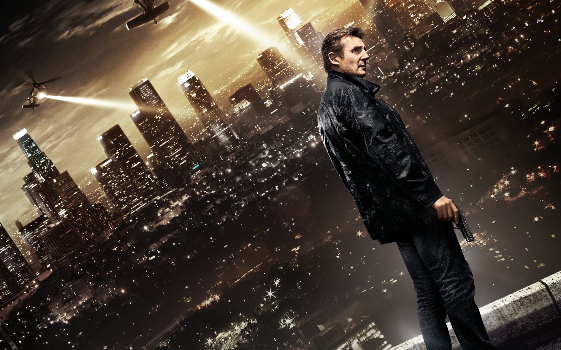O herói do filme com uma arma na mão contra o pano de fundo da cidade moderna