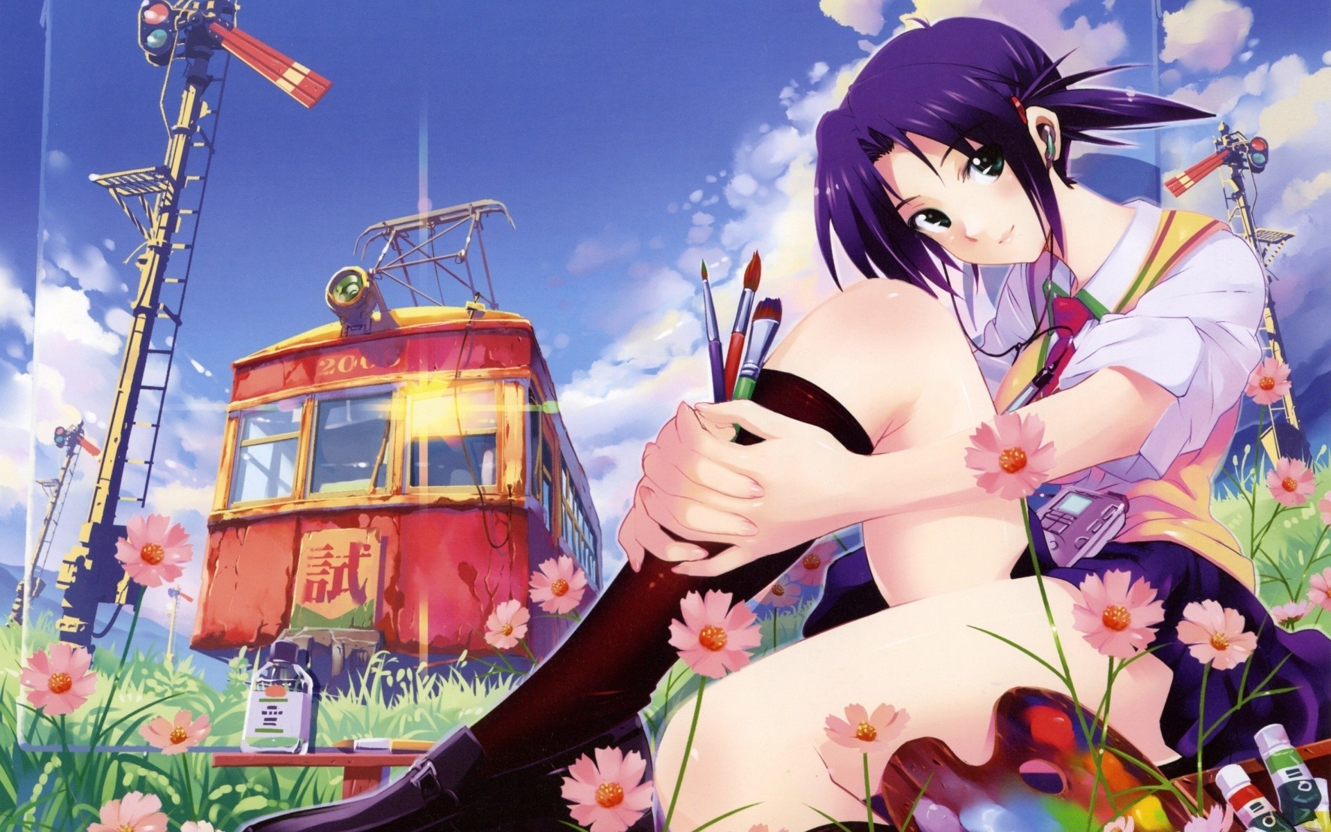 Heroína de anime sentada na grama entre as flores, com pincéis, paleta e cores, ao lado do bonde vermelhoHeroína de anime sentada na grama entre as flores, com pincéis, paleta e cores, ao lado do bonde vermelho