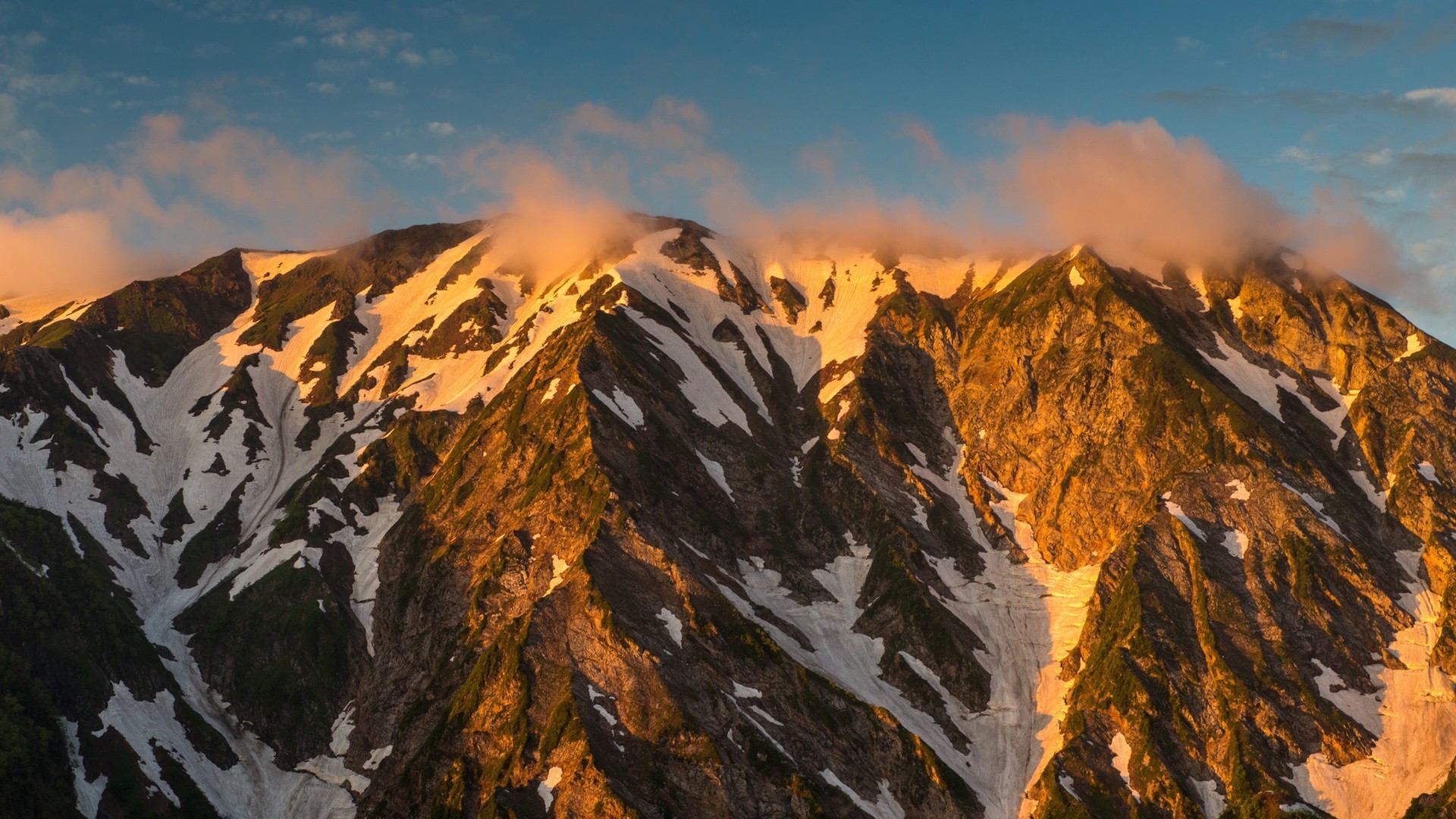 Montanhas cobertas de neve com Pôr do sol laranja