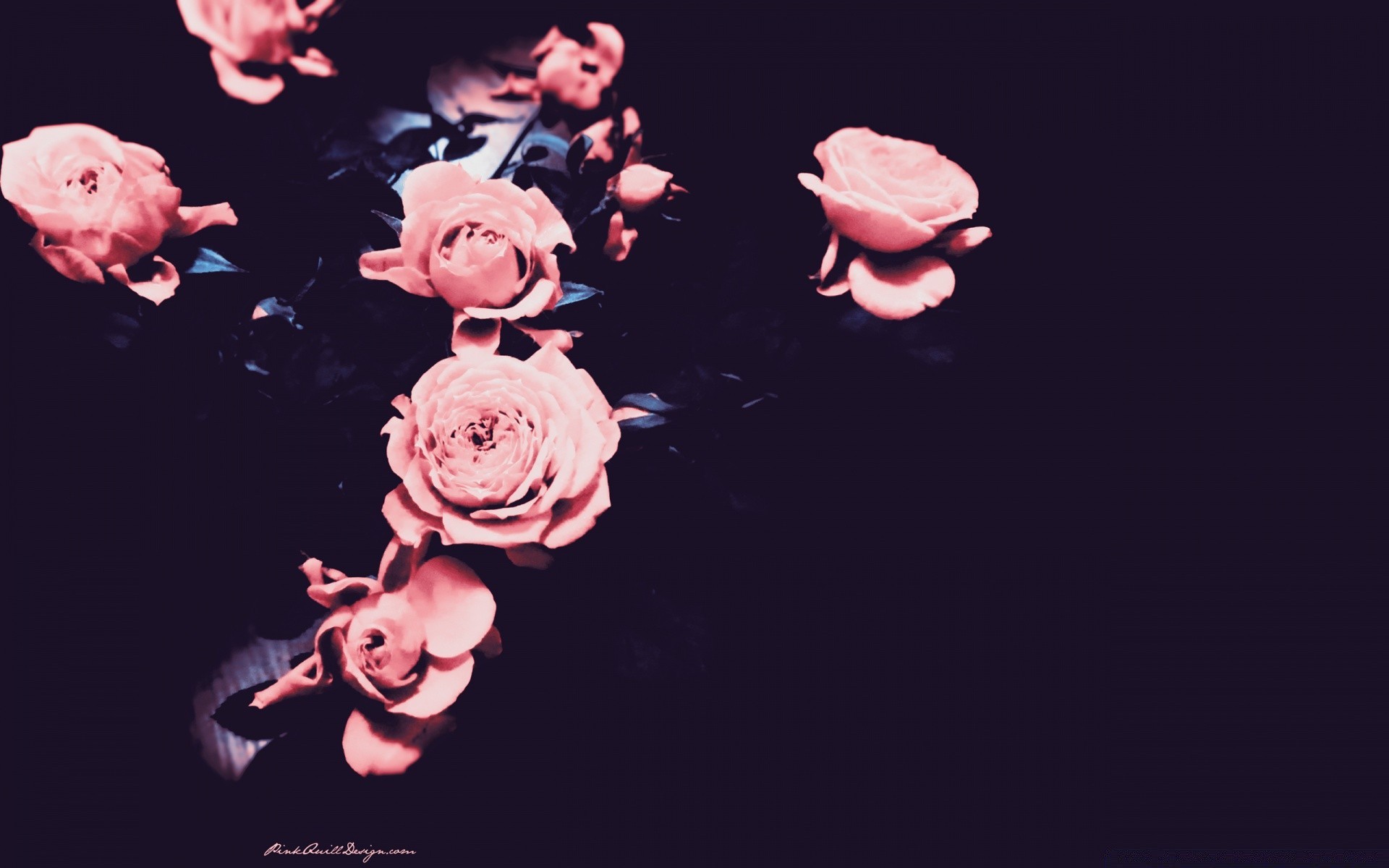Flores com folhas cor-de-rosa contra um fundo verde escuro