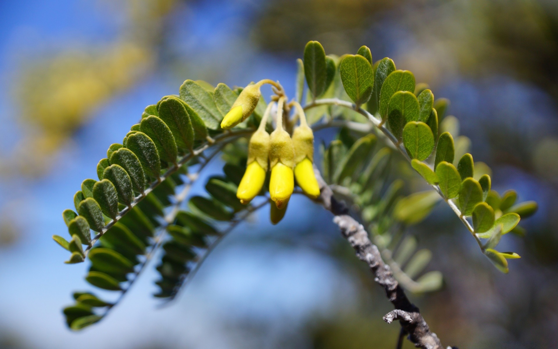Flores em forma de botas amarelas em um galho com pétalas verdes