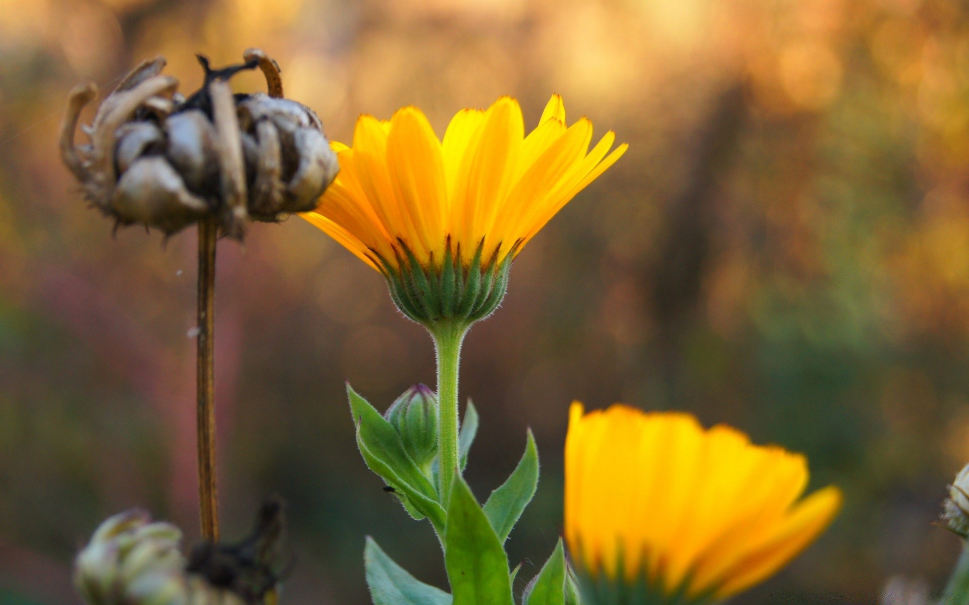 Flores silvestres brilhantes no fundo de uma floresta verde