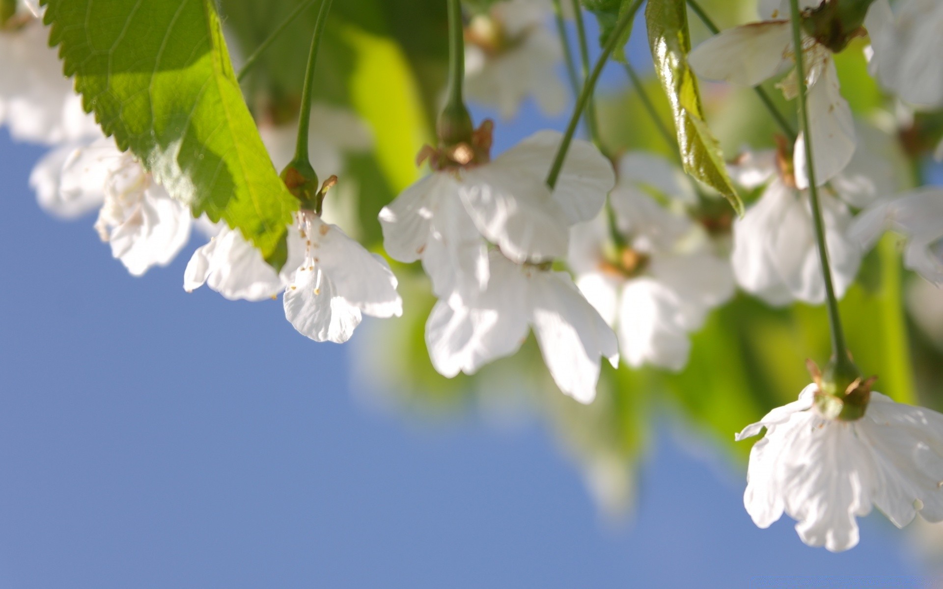 Flores de cerejeira florescendo entre a folhagem no fundo do céu azulFlores de cerejeira florescendo entre a folhagem no fundo do céu azul