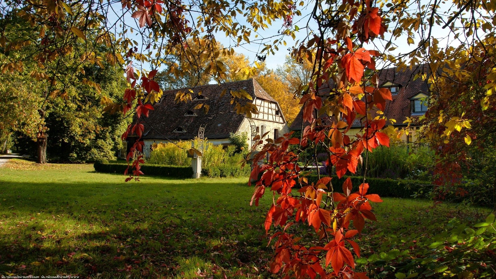 Temporada de outono com casas e chalés mais árvores com folhasTemporada de outono com casas e chalés mais árvores com folhas