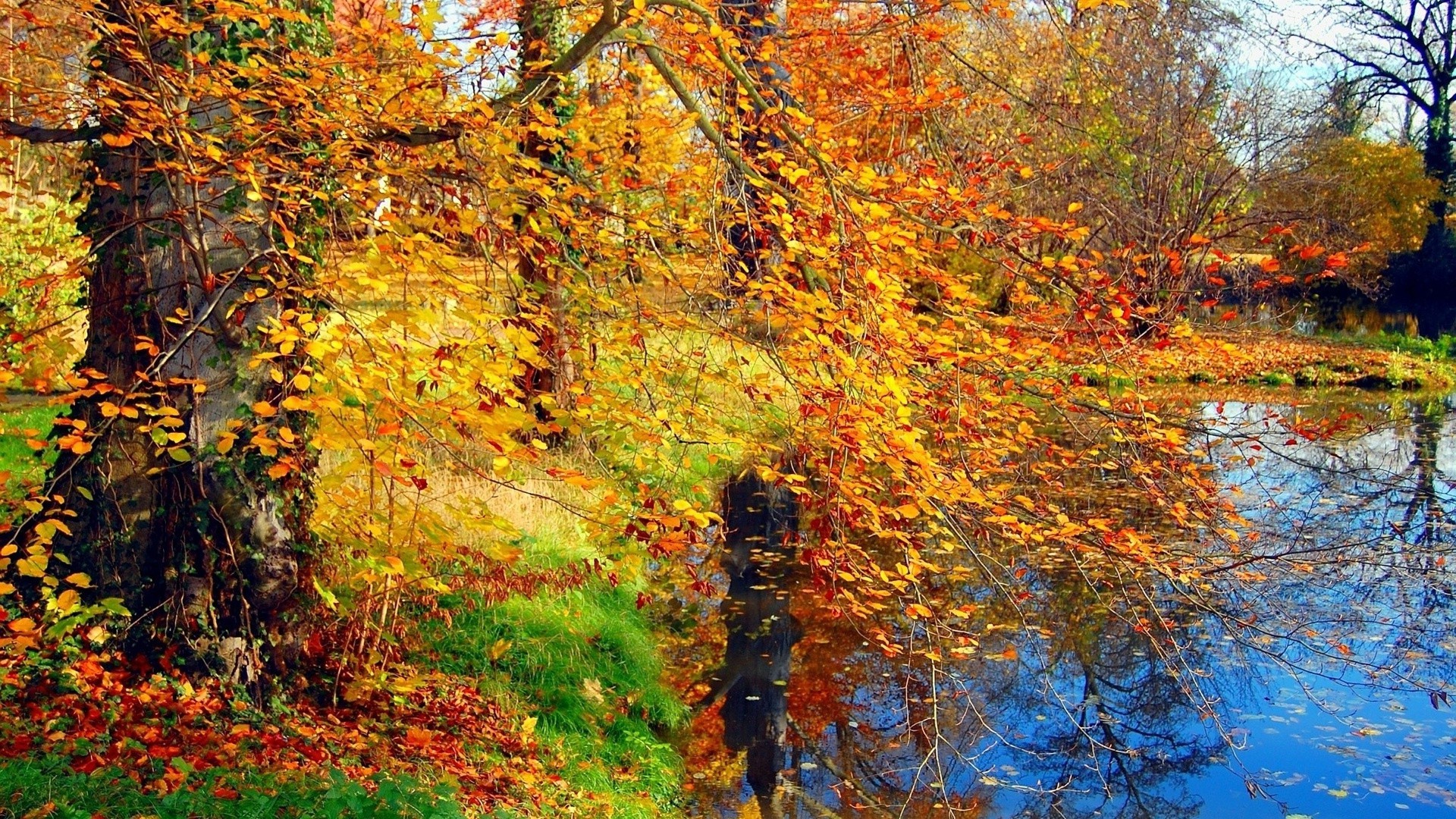 Árvores de outono com folhas brilhantes e Lagoa