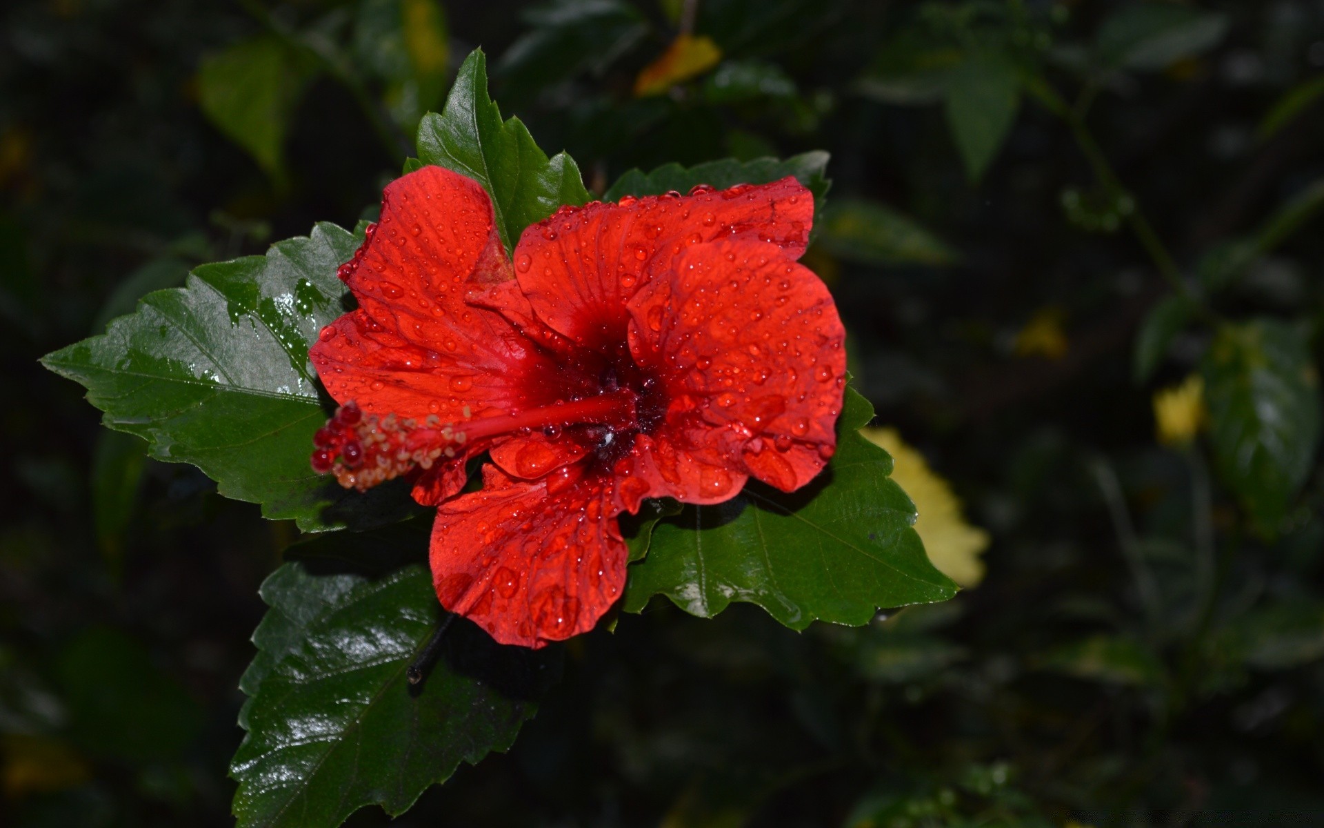 Flor vermelha com folhas molhadas em um fundo escuro