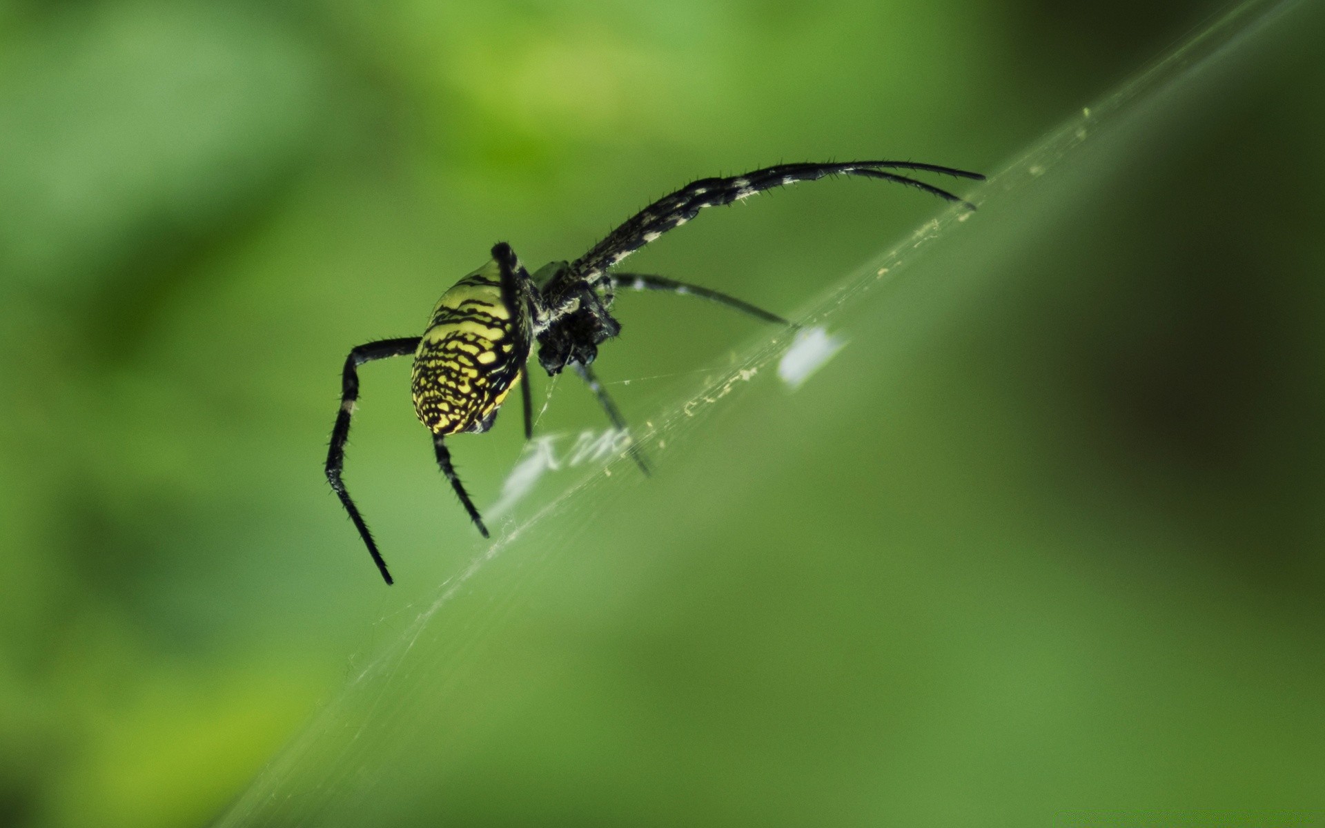 Aranha amarelo-preta em pé sobre uma teia de aranha no fundo do verde