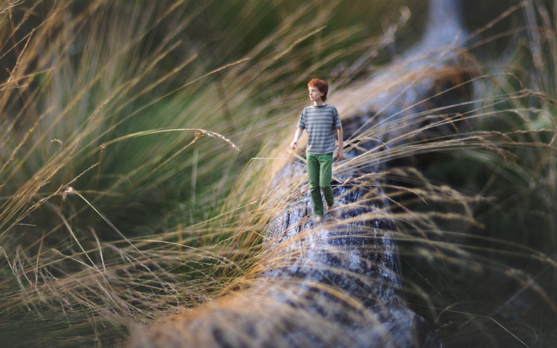 Foto criativa de um homem de papelão perto de uma fonte de água