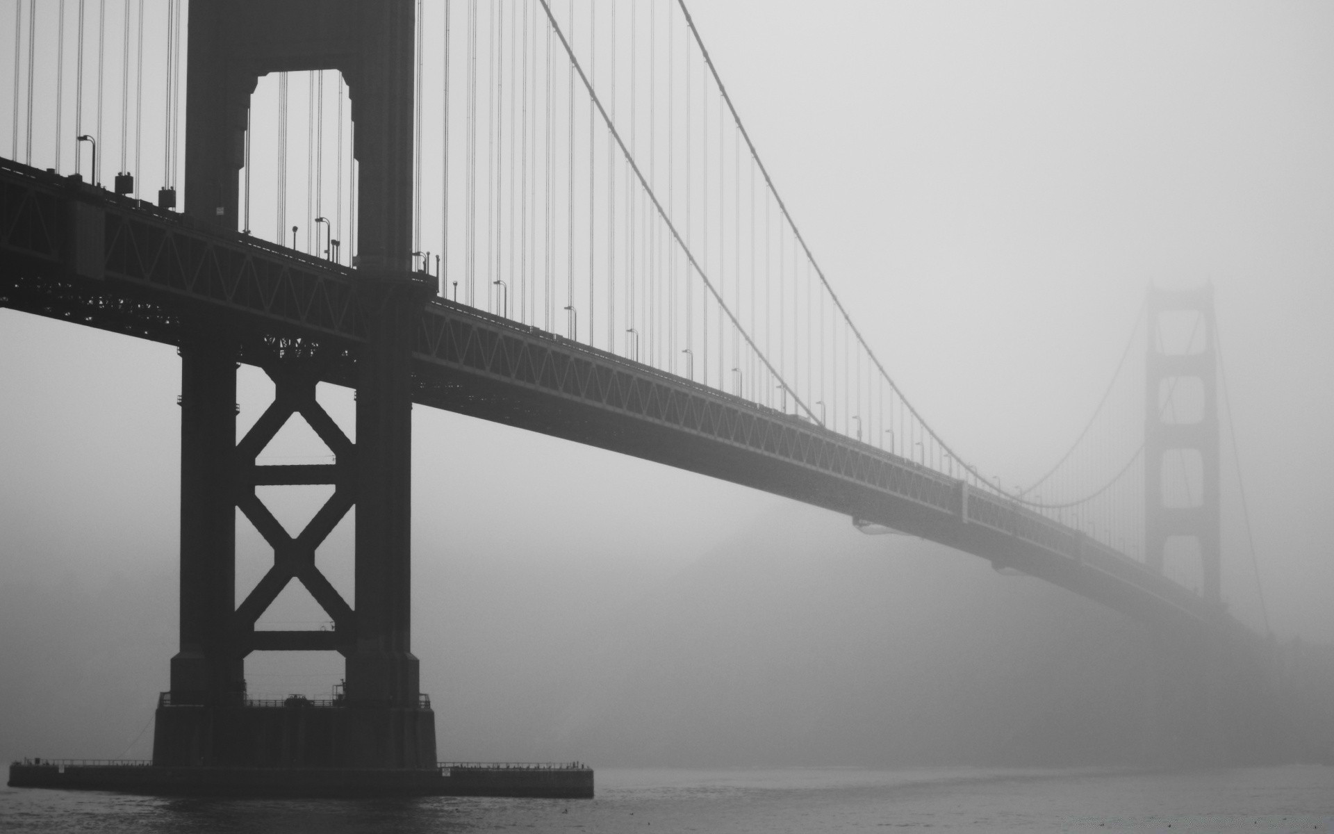 Foto em preto e branco de uma ponte suspensa no nevoeiro