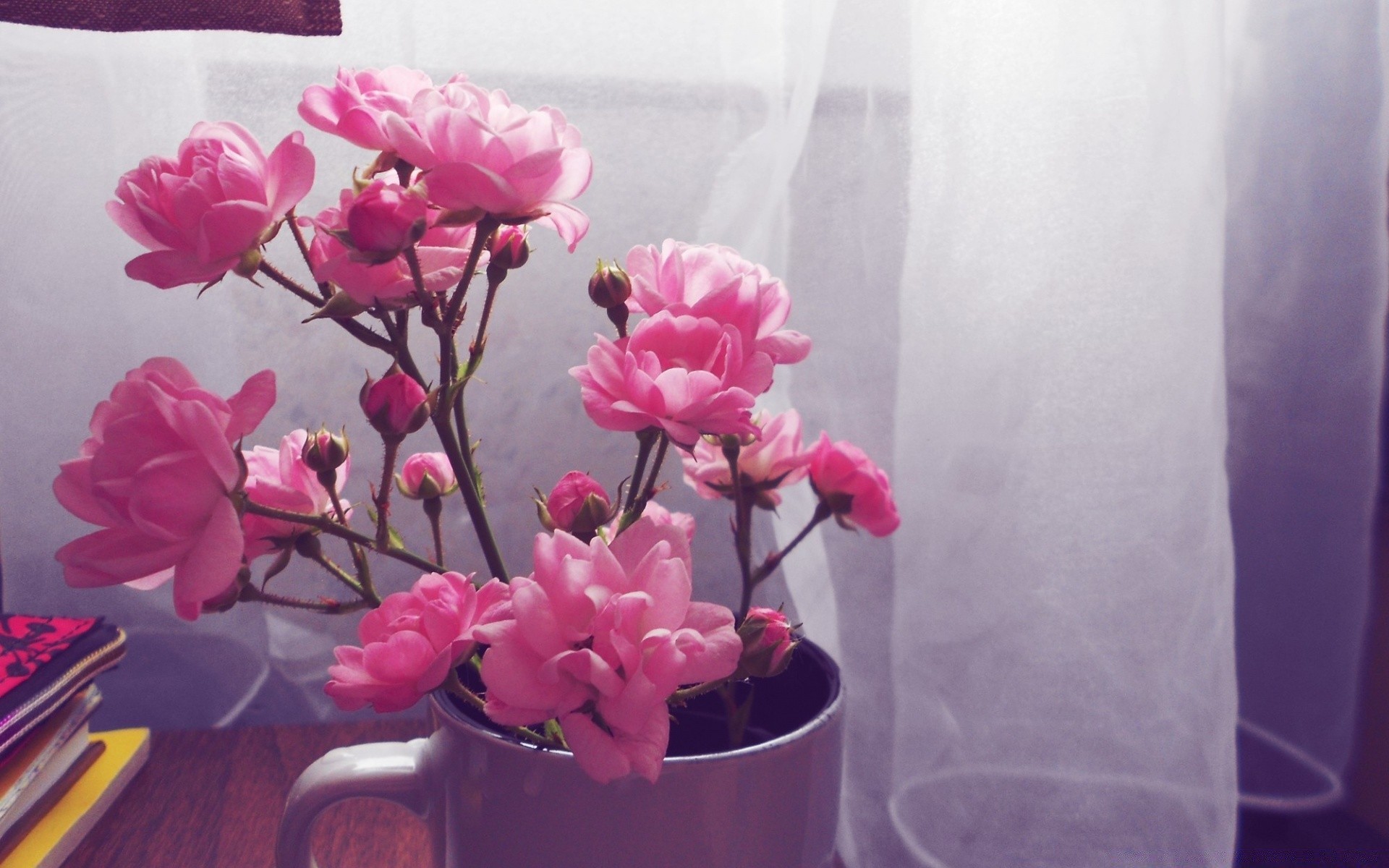 Foto minimalista de flores cor-de-rosa em uma caneca no fundo das cortinas