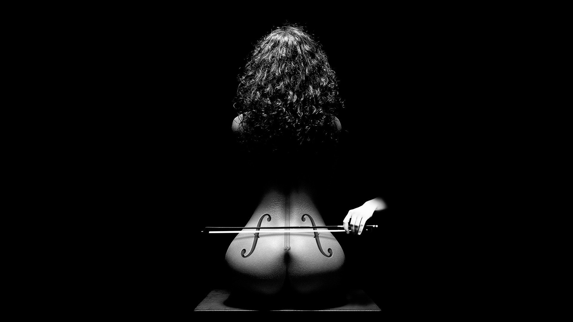 Foto em preto e branco de mulher nua estilizada em violoncelo