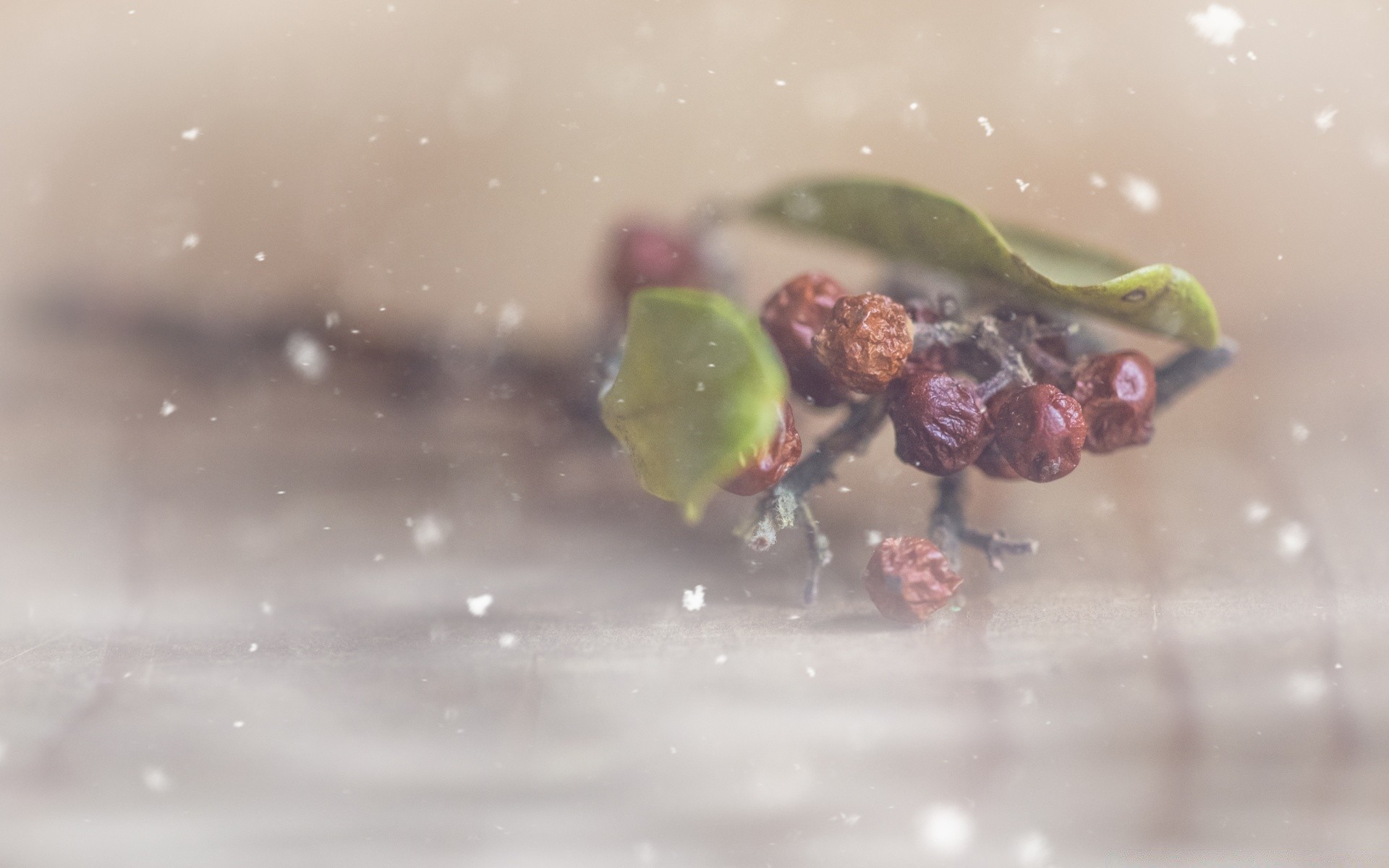 Fotografia Macro de um galho quebrado com folhas e bagas secas que caíram na superfície da água