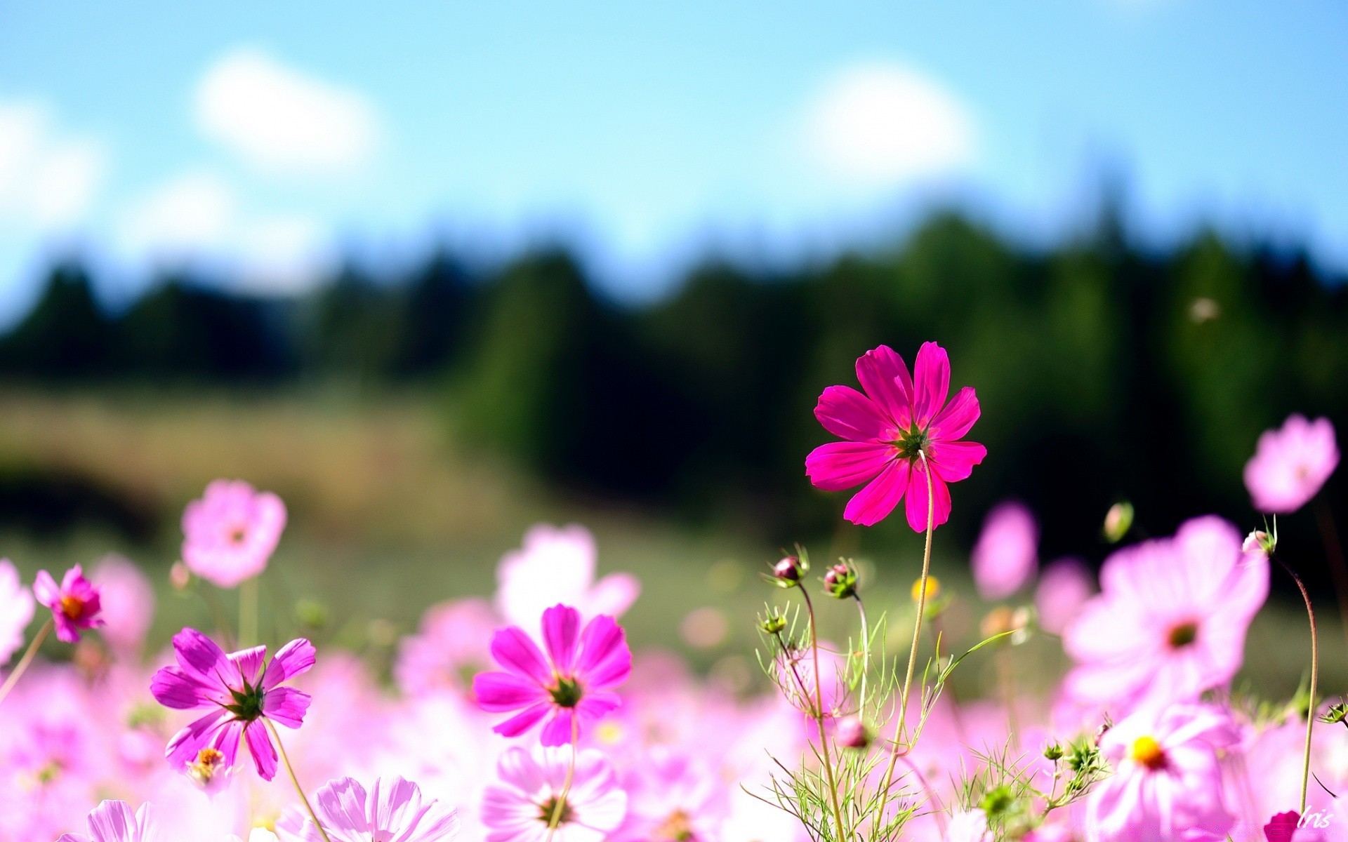 Flores silvestres brilhantes no fundo de uma floresta verde